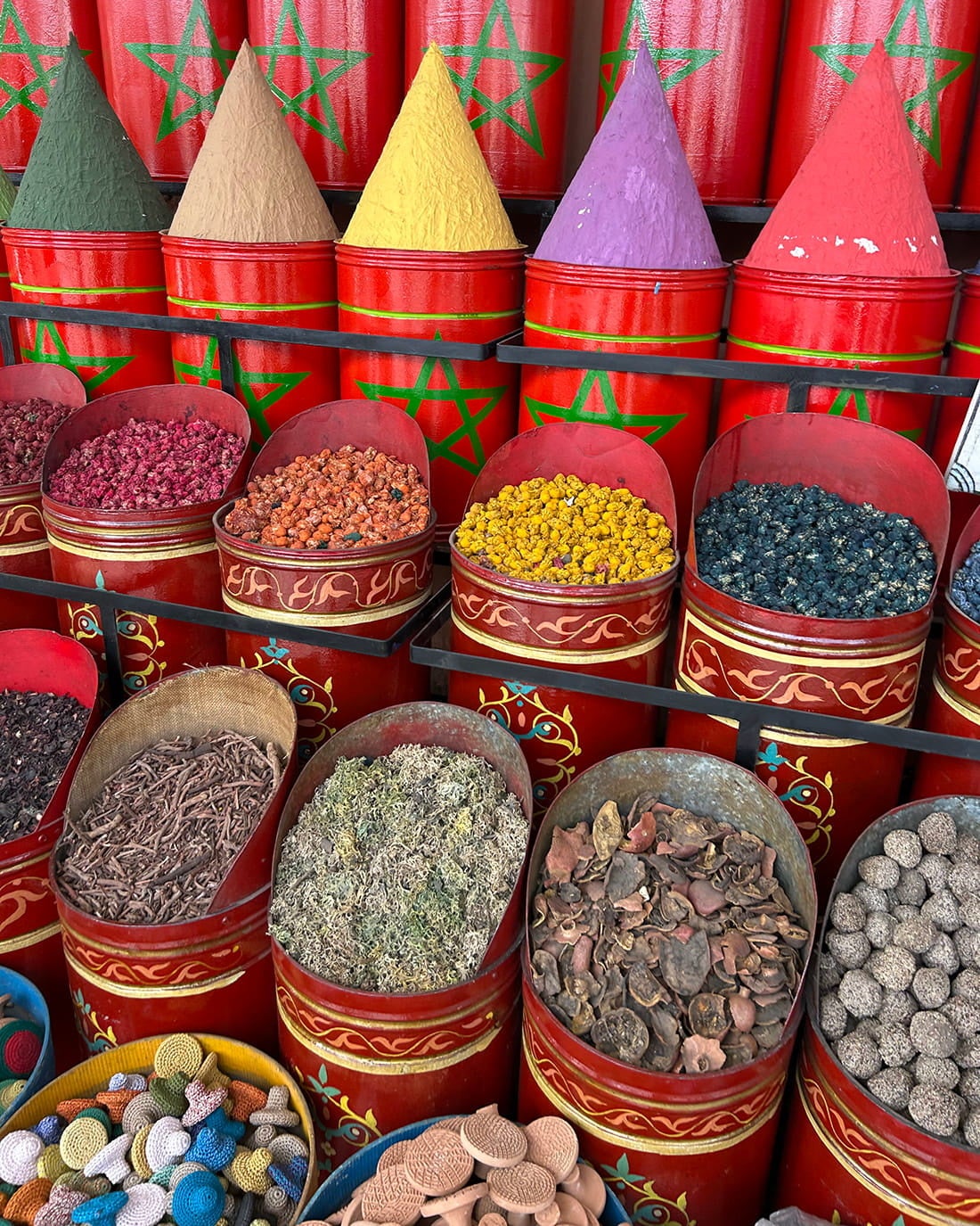 店主・山崎が現地を訪れ、実際に体感した空気感や街の色彩、文化的背景をもとに、二つのスワッグを制作しました。乾いた大地、強い日差し、鮮やかな街並みや市場の活気など、モロッコが持つ多面的な魅力を、植物の色合いや質感によって表現しています。