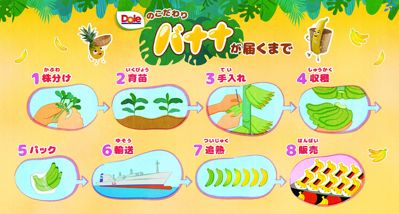 さらに体験終了後には、バナナが栽培されてから私たちの手に届くまでの工程をイラストで見ることができるので、お子さまの知育・教育にもお役立ていただけます。