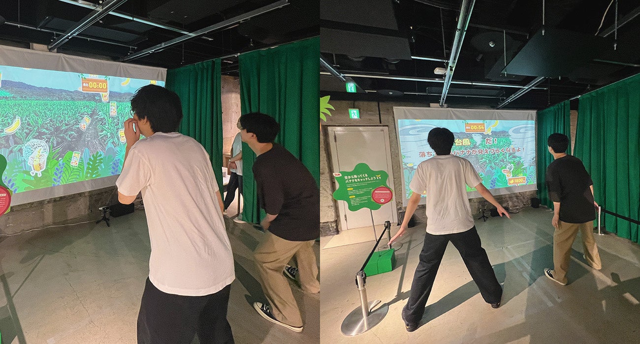 体験者が反復横跳びのような動きでキャラクターを操作し、空から降ってくるバナナをキャッチしていき、どれだけ多くのバナナをキャッチできるか体を動かしながら競い合う対戦ゲームです。