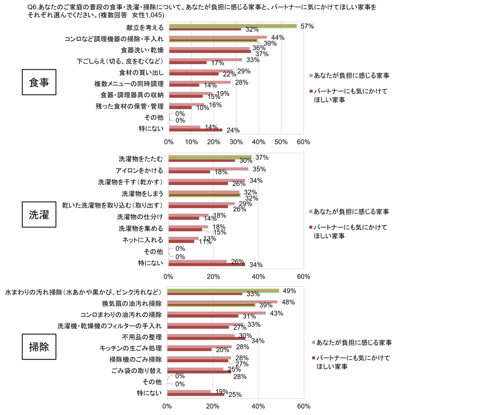 食事・洗濯・掃除について、負担に感じる家事を聞きました。その結果、女性が負担に感じる家事の上位は、食事「献立を考える」(57%)、掃除「水まわりの汚れ掃除」(49%)、洗濯「洗濯物をたたむ」(37%)でした。また、女性がパートナー(夫)に気にかけてほしい家事は、食事「コンロなど調理機器の掃除・手入れ」(39%)、掃除「換気扇の油汚れ掃除」(39%)、洗濯「洗濯物をしまう」(32%)でした。