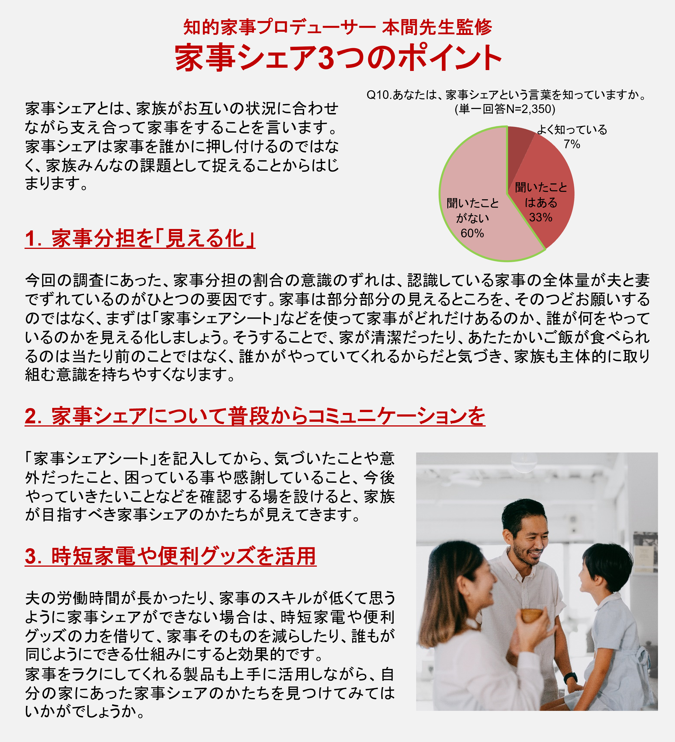 今回の調査にあった、家事分担の割合の意識のずれは、認識している家事の全体量が夫と妻でずれているのがひとつの要因です。家事は部分部分の見えるところを、その都度お願いするのではなく、まずは「家事シェアシート」などを使って家事がどれだけあるのか、誰が何をやっているのかを見える化しましょう。そうすることで、家が清潔だったり、あたたかいご飯が食べられるのは当たり前のことではなく、誰かがやっていてくれるからだと気づき、家族も主体的に取り組む意識を持ちやすくなります。