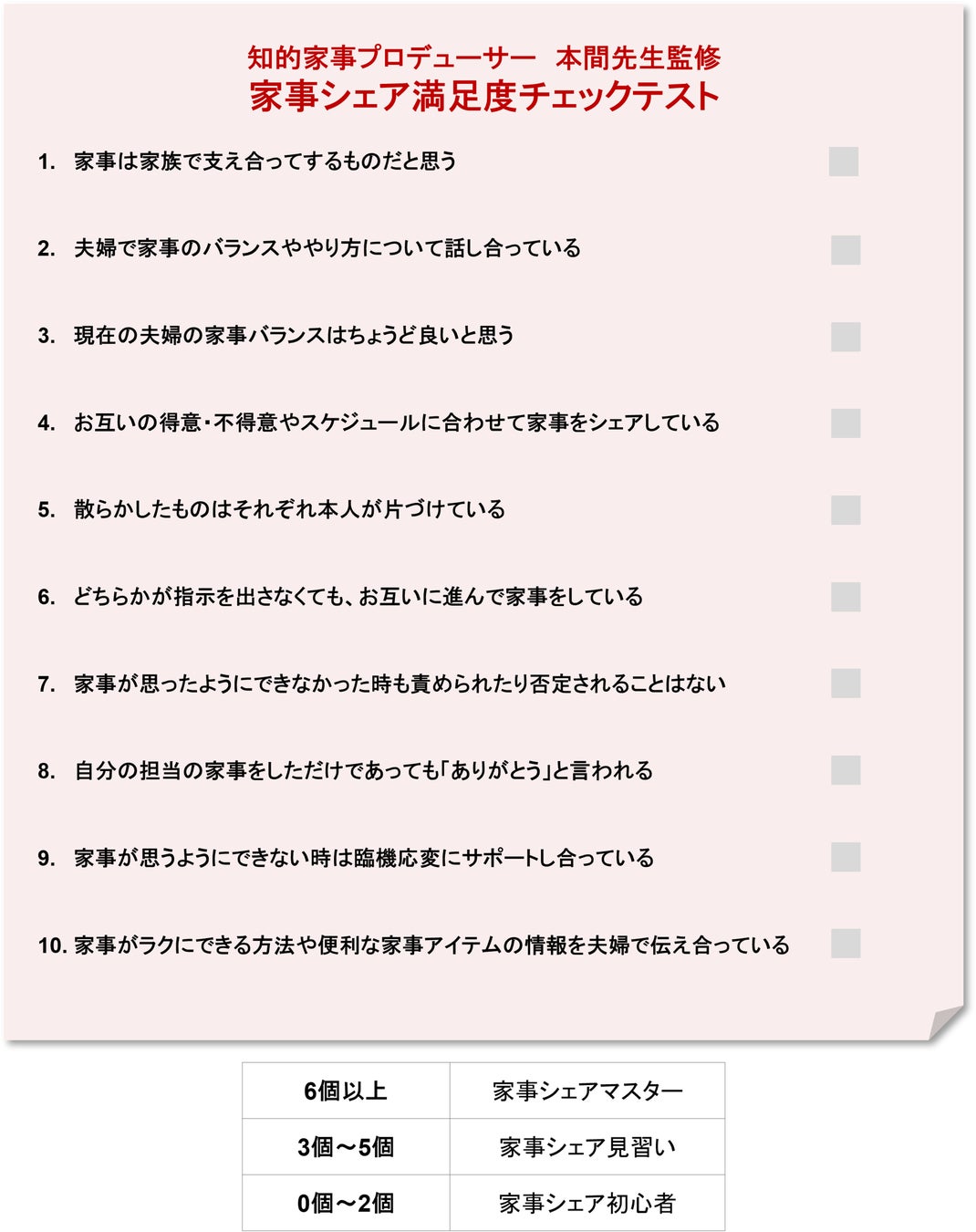 知的家事プロデューサー本間先生監修「家事シェア満足度チェックテスト」