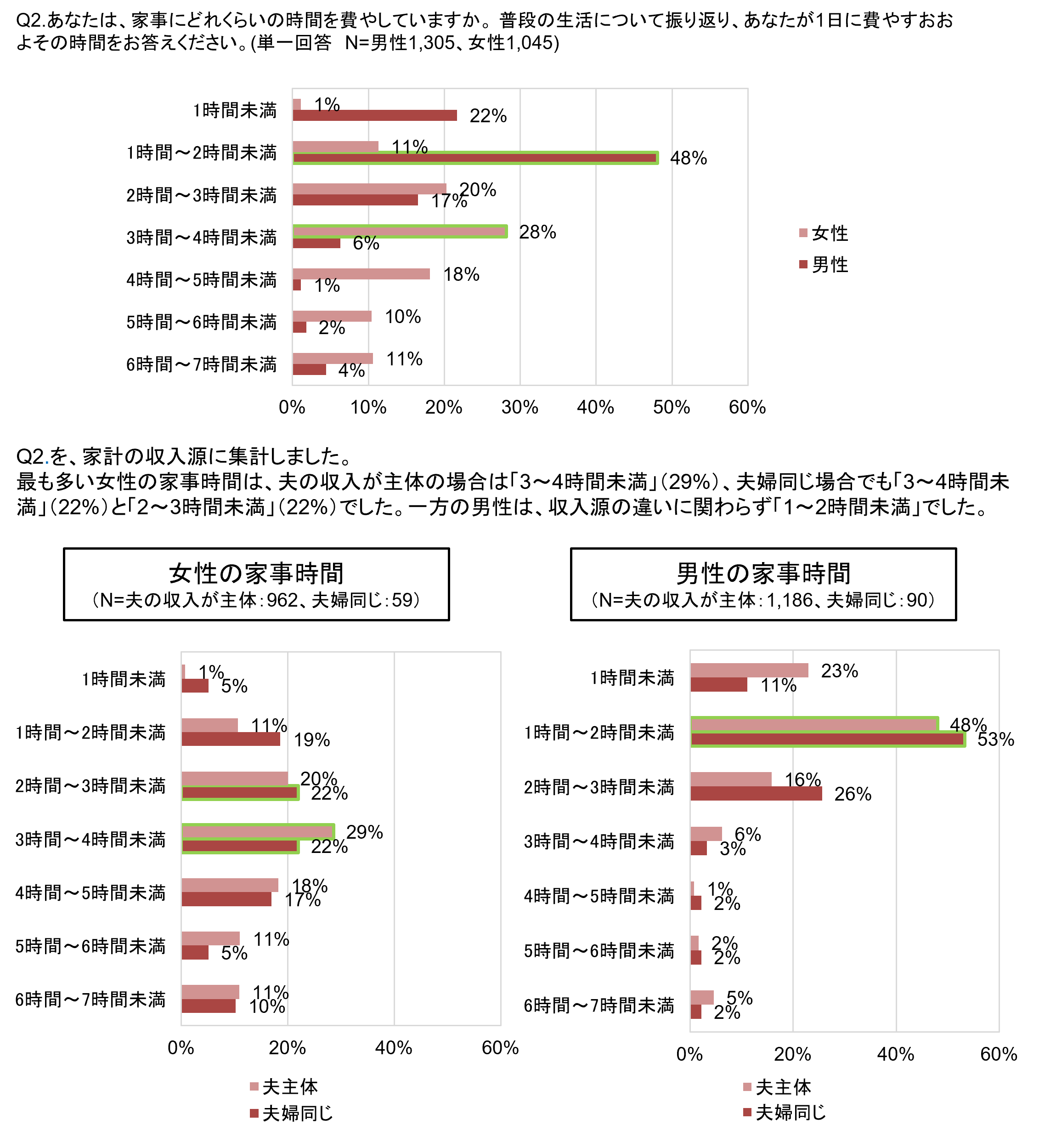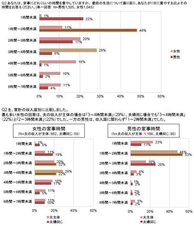 1日の家事に費やしている時間を聞きました。最も多い回答は、女性が「3時間~4時間未満」(28%)、男性が「1時間~2時間未満」(48%)でした。