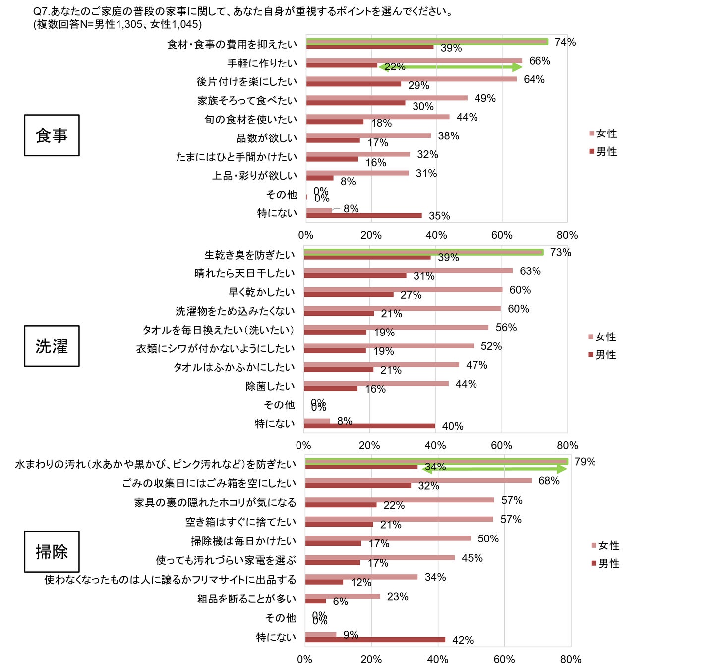 食事・洗濯・掃除について重視するポイントを聞きました。その結果、女性に最も多い回答は、掃除「水まわりの汚れを防ぎたい」(79%)、続いて食事「食材・食事の費用を抑えたい」(74%)、洗濯「生乾き臭を防ぎたい」(73%)でした。女性と男性で最も回答に差がある項目は掃除「水まわりの汚れを防ぎたい」(45ポイント差)、続いて食事「手軽に作りたい」(44ポイント差)でした。