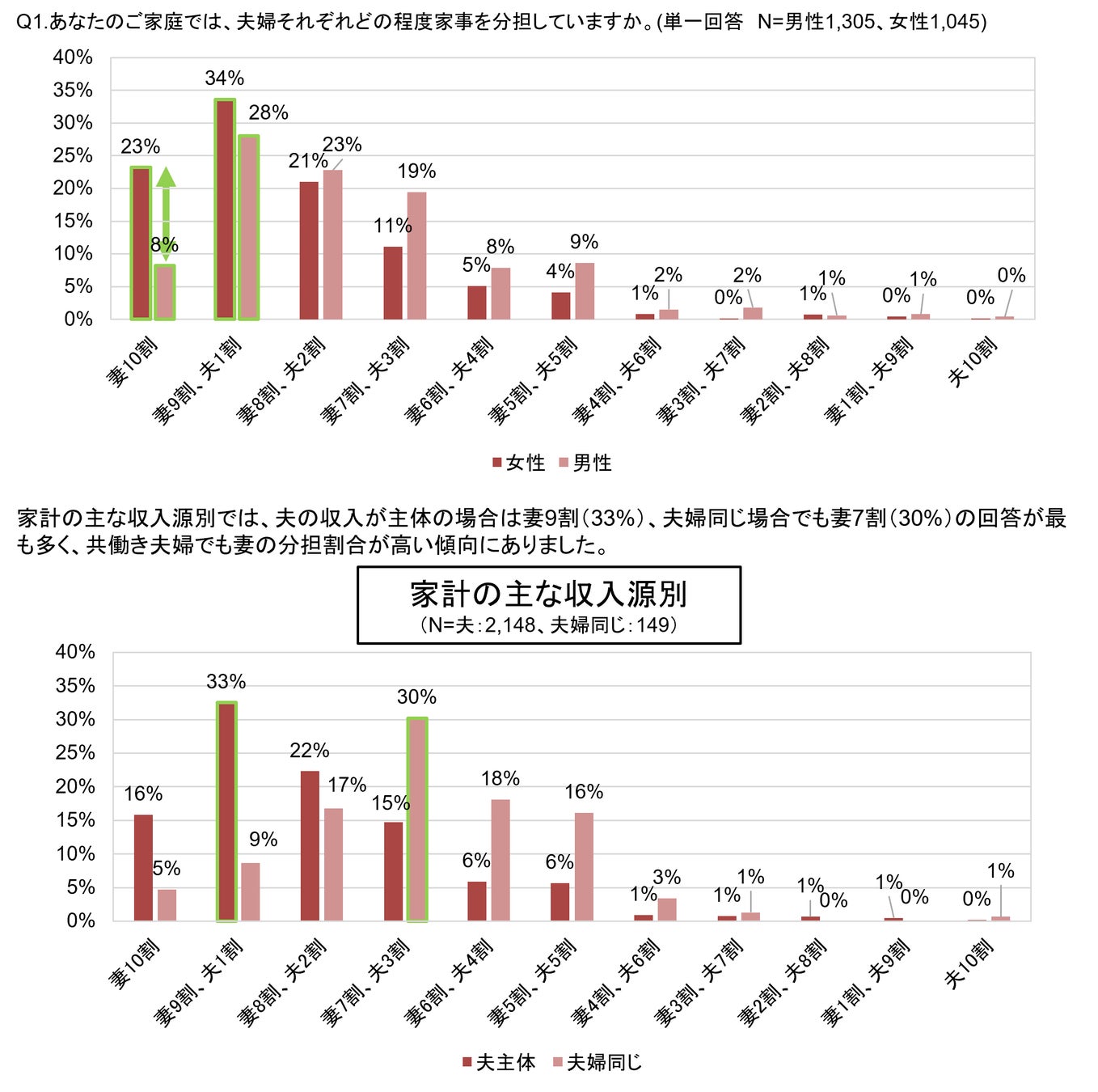 Q1.の夫婦の家事分担の割合では、「妻10割」など男女の回答に大きな差が見られました。