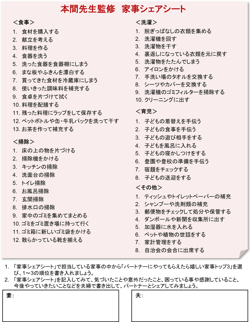 知的家事プロデューサー 本間先生監修の「家事シェアシート」で夫婦の家事の割合を再確認しましょう。