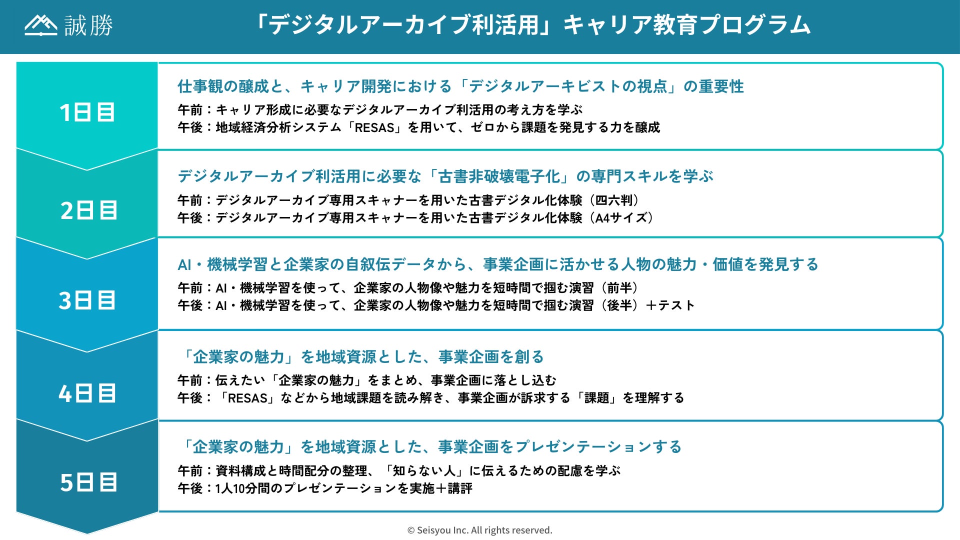本キャリア教育プログラムは、地域経済のキーパーソンに関する歴史資料から、AI・機械学習などの技術を用いて功績や偉業を再発見し、地域・企業の課題解決に活かす全5日間のプログラムです。