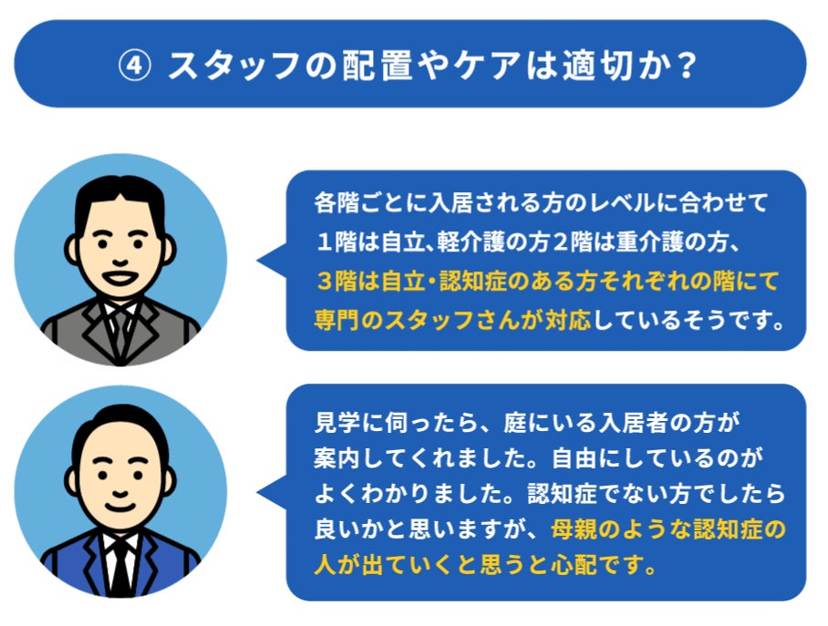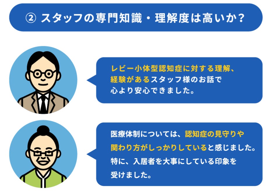 ②「適切な認知症ケアを行ってくれるのか?」は大きな関心事になっています。実際にケアにあたるスタッフが認知症に理解があり、なおかつ経験があることは大きなポイントとなります。