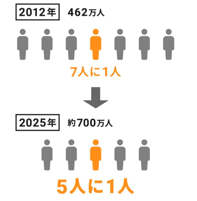 2012年の時点で462万人だった認知症の高齢者数は、2025年には各年齢の認知症有病率が2012年以降一定と仮定した場合、675万人に達すると推計されています。認知症高齢者の割合は、2012年時点で7人に1人であったのに対して、2025年には5人に1人になる計算です。