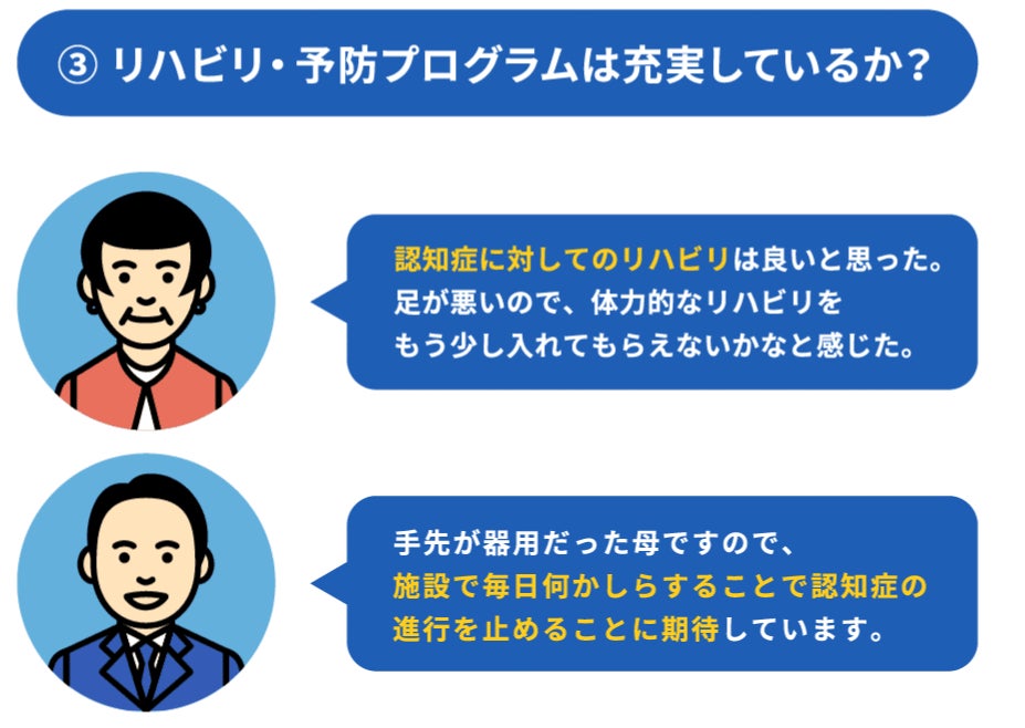 ③入居検討者は「入居後に認知症が進行してしまわないか」と心配しています。認知症予防プログラムが取り入れられているかなど、施設独自の取り組みに注目しているようです。