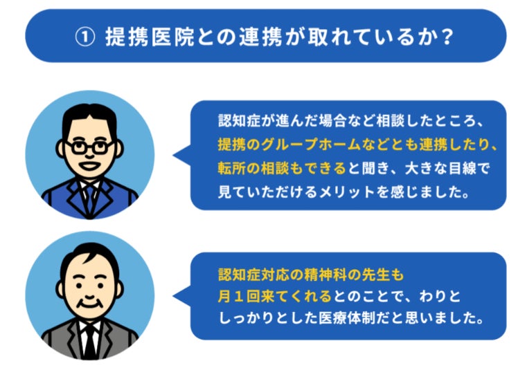 ①入居検討者は、既に認知症がある場合や、入居後に認知症が進行した場合のことなども考えてくれる施設であるかどうかを見ているようです。