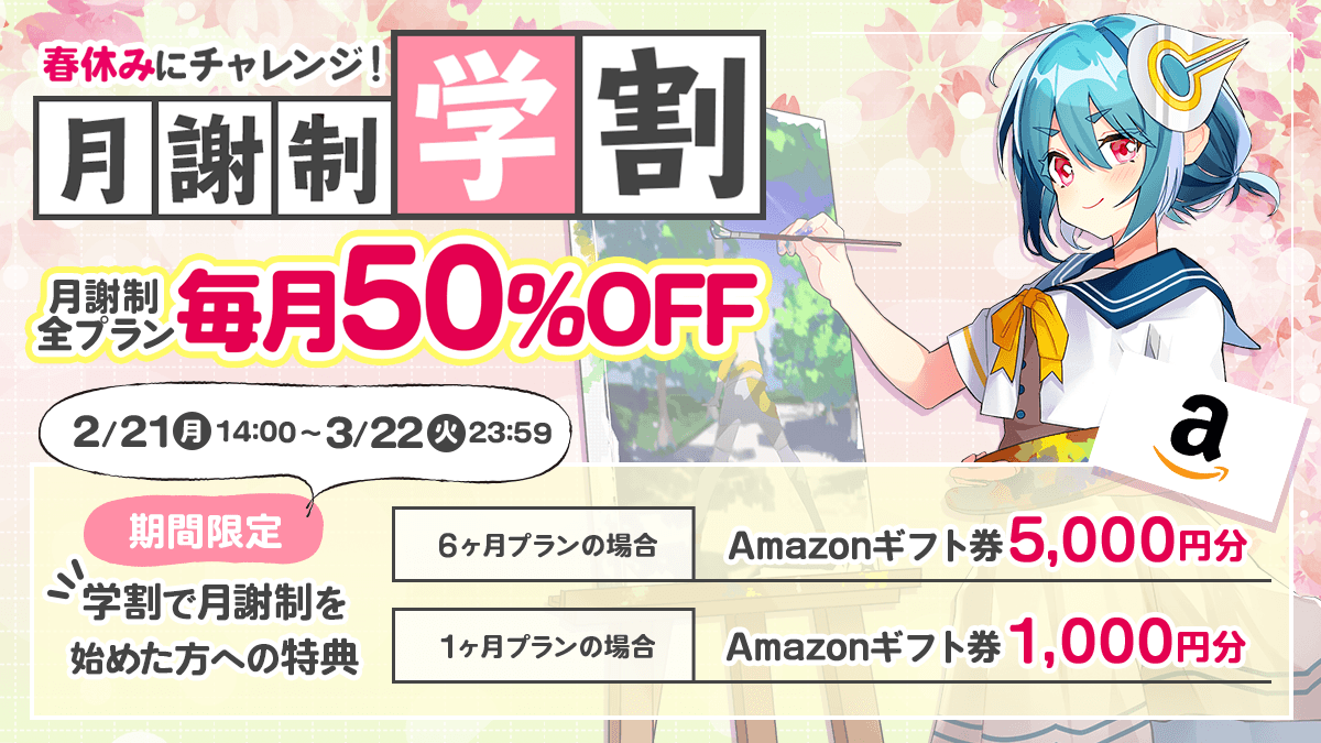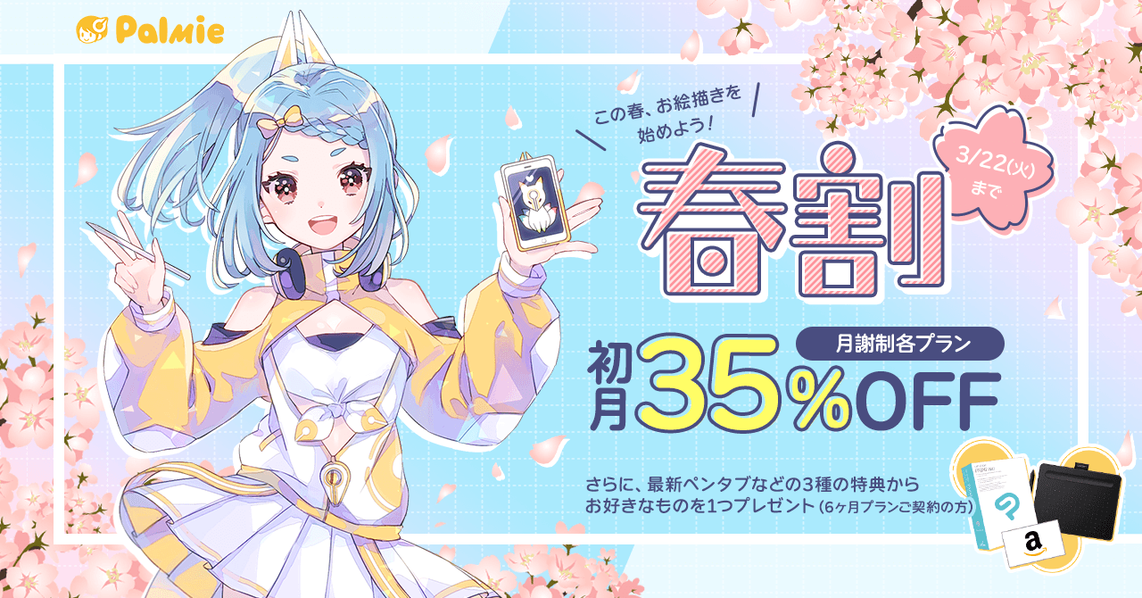 株式会社パルミー(所在地:東京都港区、代表取締役:伊藤貴広、以下パルミー)は、本日3月7日(月)14時00分〜3月22日(火)23時59分までの期間「初月受講料が35%OFF!春割」を開催いたします。また、「Amazonギフト券最大5,000円プレゼント!学生応援キャンペーン」も開催中!春休みはパルミーでお絵描きを始めてみませんか?