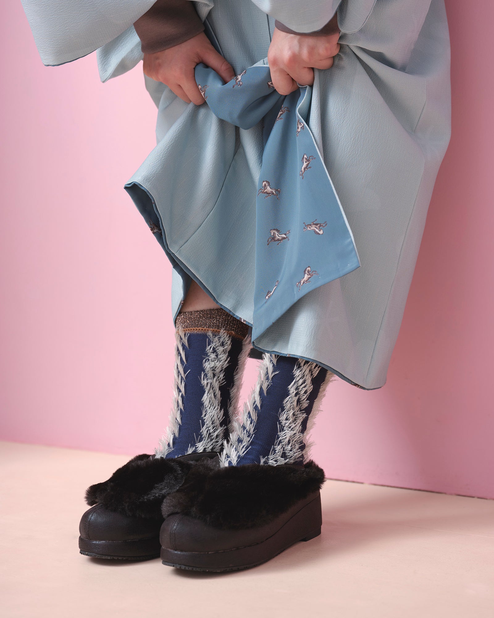 歩く度にちらっと裾から覗く木馬の裏地(別売)をお好みで取り付けたら、こだわりが詰まったあなただけの着物の完成です。