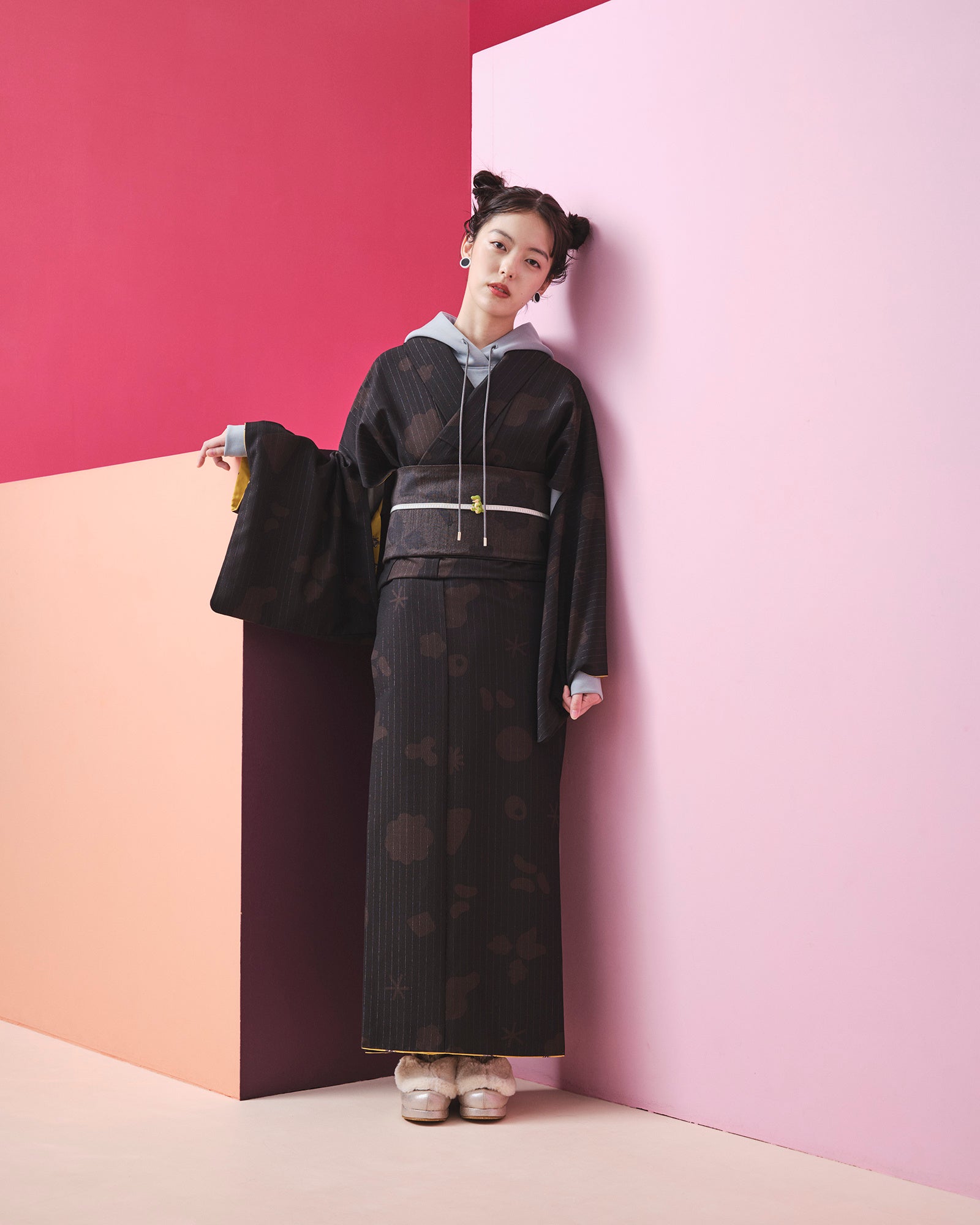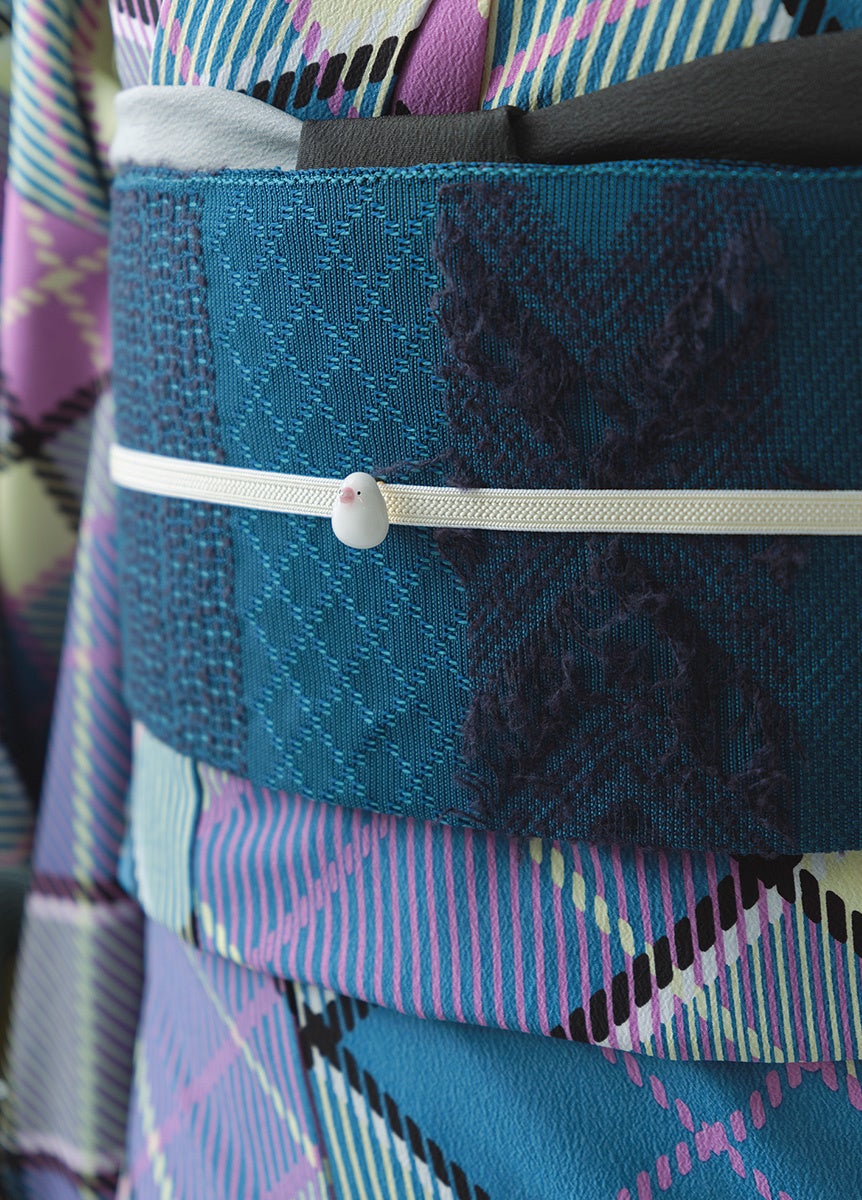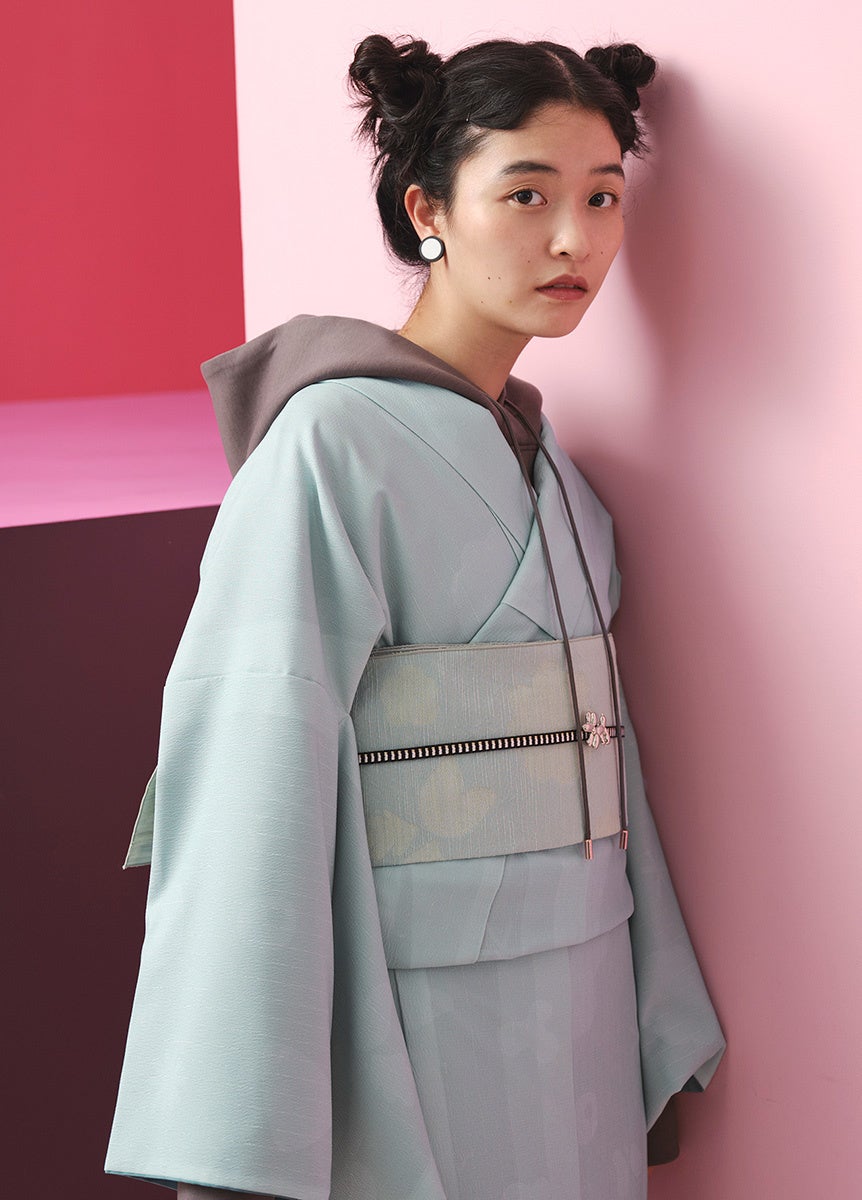 積み木やお花のモチーフを抽象的にくずしてデザイン。モチーフをあえて生地と同系色にすることで、小紋でありながらも無地感覚の着物としてご着用いただけます。同柄のへこ帯を合わせることで、セットアップコーデも可能。