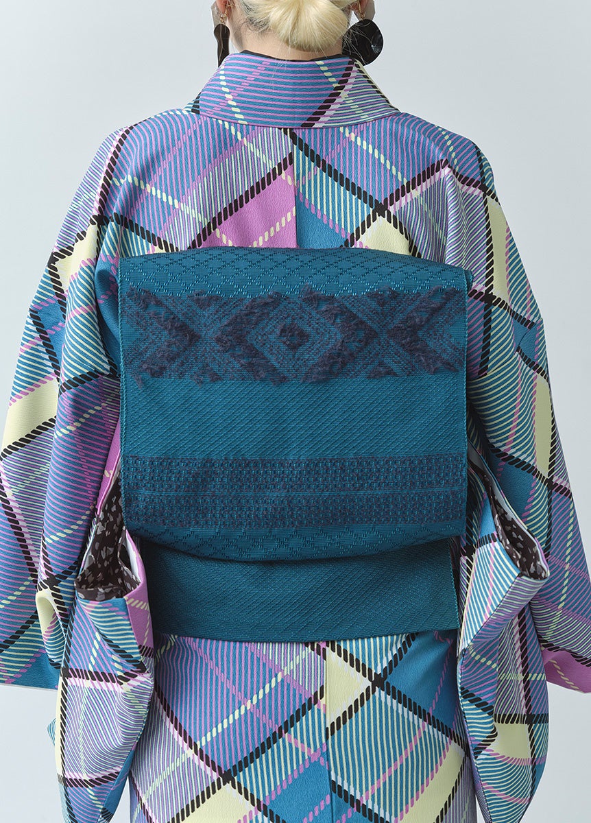 無地織の名古屋帯にウールの糸を織り込むことで柄を表現。ウール糸部分はお好みではさみでカットを入れることでフリンジのようにアレンジが可能です。織物の産地で有名な群馬県・桐生の技術力にあそび心をMixした帯。箱や扉を開ける時のワクワク感を表現したとともに、自分で手を加える楽しみとかけ合わせました。