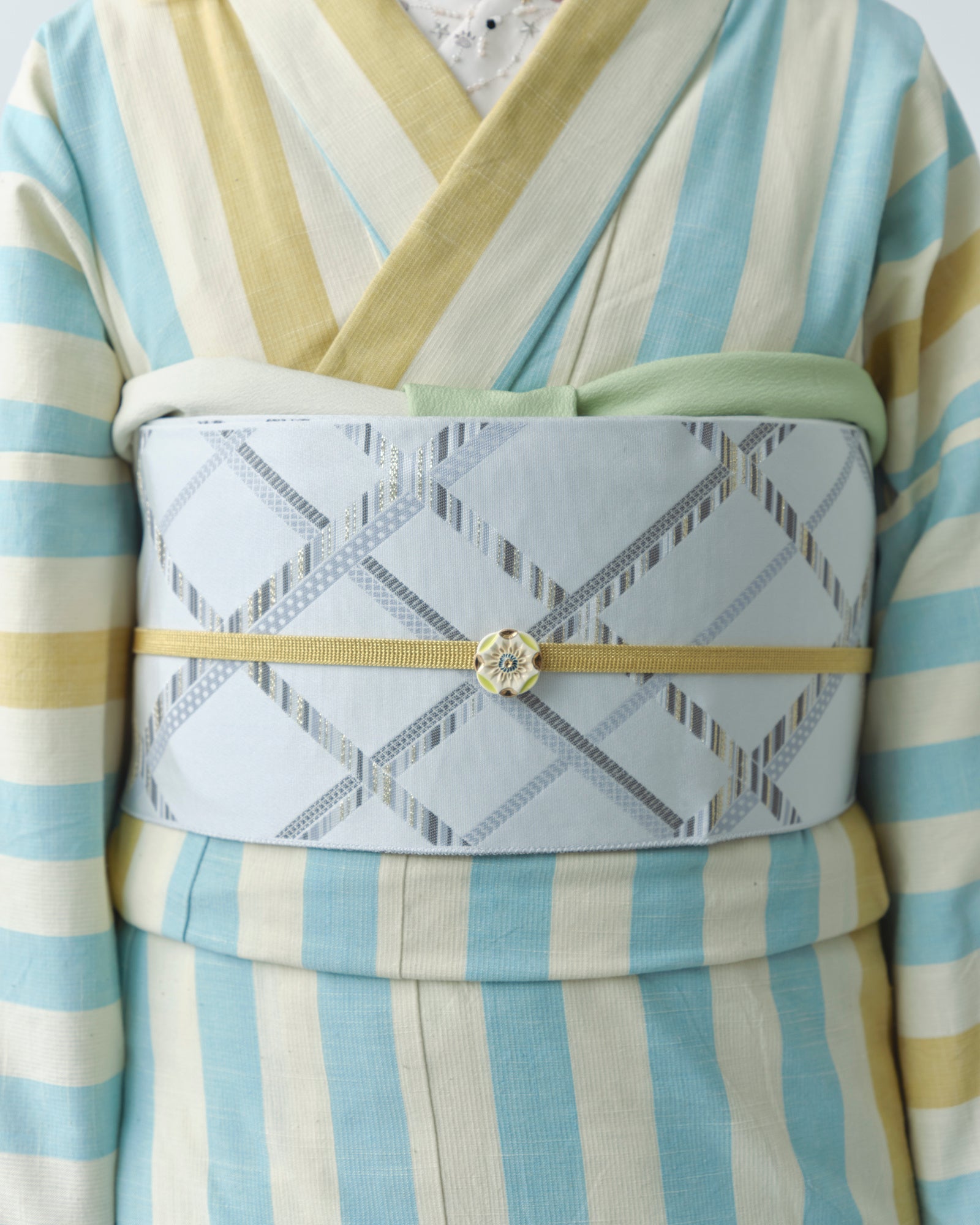 宝物の入ったおもちゃ箱をお気に入りのマスキングテープを使ってデコレーションしたようなライン柄をデザインした博多織の半巾帯。結びやすく無彩色な帯は季節を問わず様々なコーディネートで活躍すること間違い無しです。