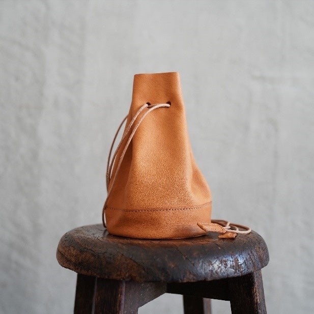 商品紹介:ランタンをモチーフにした、巾着バッグです。 巾着の紐は長さアレンジができて、 手提げとショルダーバッグの2wayで持つことができます。 使用している革は、墨田で作られた豚革です。