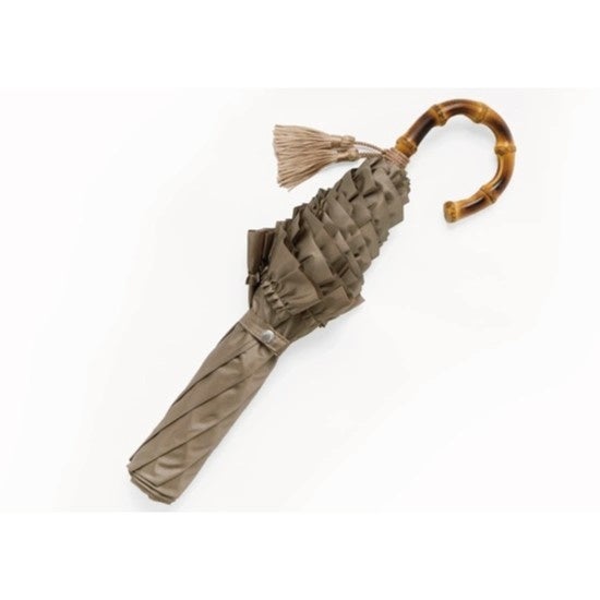 商品紹介:職人がひとつひとつ丁寧に作るUVカット機能付きの折りたたみ傘です。スモーキーなカフェモカカラーの折りたたみ傘は、シンプルなフリルにタッセル付きの竹の手元を付け、オトナ可愛く仕上げました。