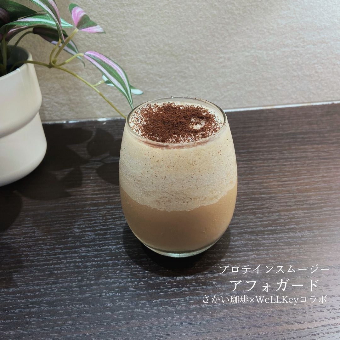 また、コーヒーを愛飲してくださっているお客様にもお手軽にお試しいただけるよう、「アフォガード」を開発しました。さかい珈琲オリジナルブレンドコーヒーやエスプレッソ、バニラアイスにソイプロテイン5gが入ったカラダにやさしいスムージーです。コーヒーを飲んでたんぱく質が摂れる、新感覚のスムージーです。