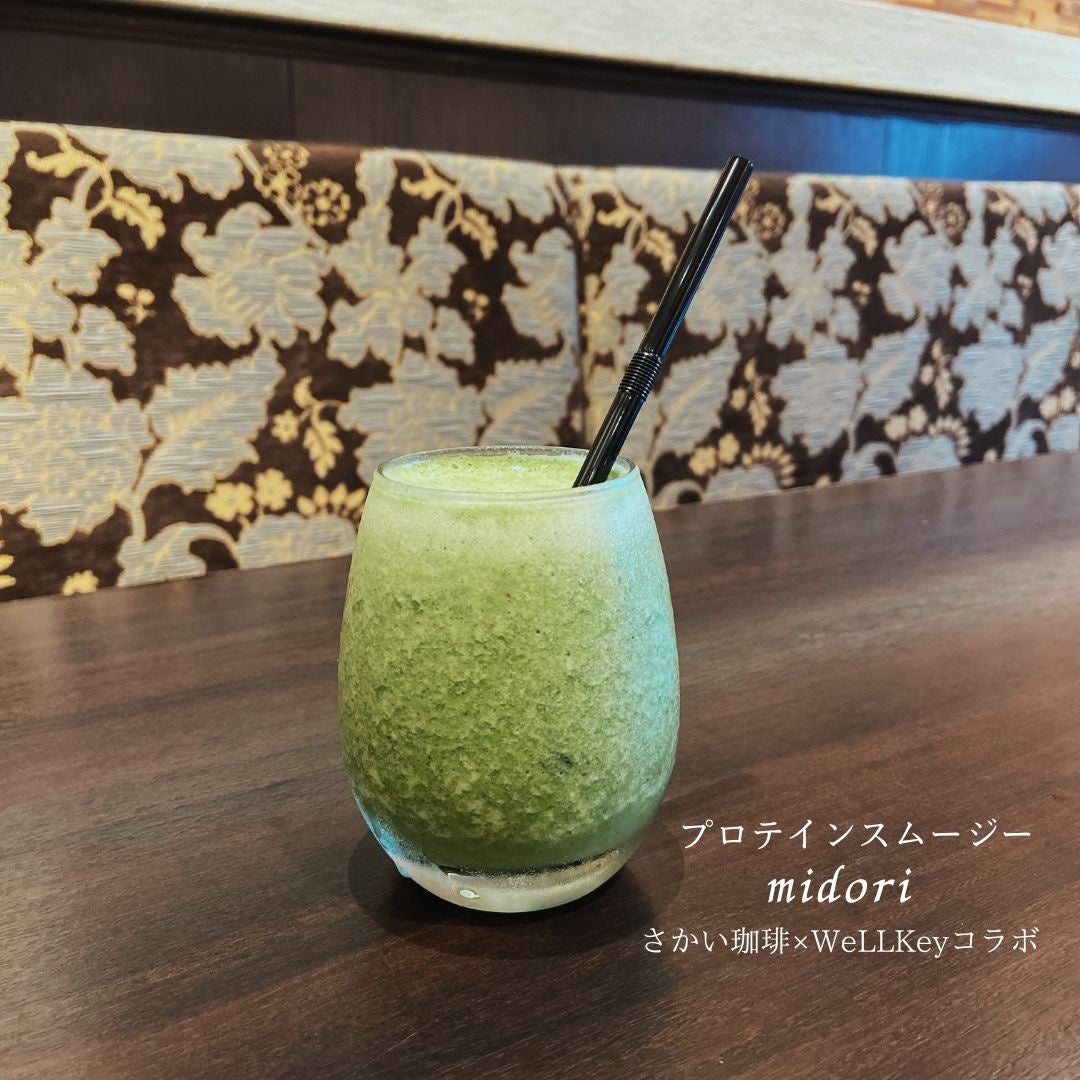 今回販売する商品は2種類。長谷川惠一氏が運営するカフェで提供している「midori」をさかい珈琲オリジナル商品として内容を新たに開発しました。ほうれんそうやフレッシュリーフなどの緑黄色野菜や、バナナ・果汁100%オレンジジュースなどの果物、そしてソイプロテイン10gが入ったカラダにやさしいスムージーです。「食べる前にお野菜を」と気を付けている方にも、タンパク質をなかなかとる機会がない、という方にもおすすめです。