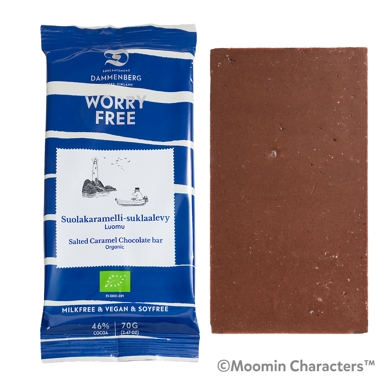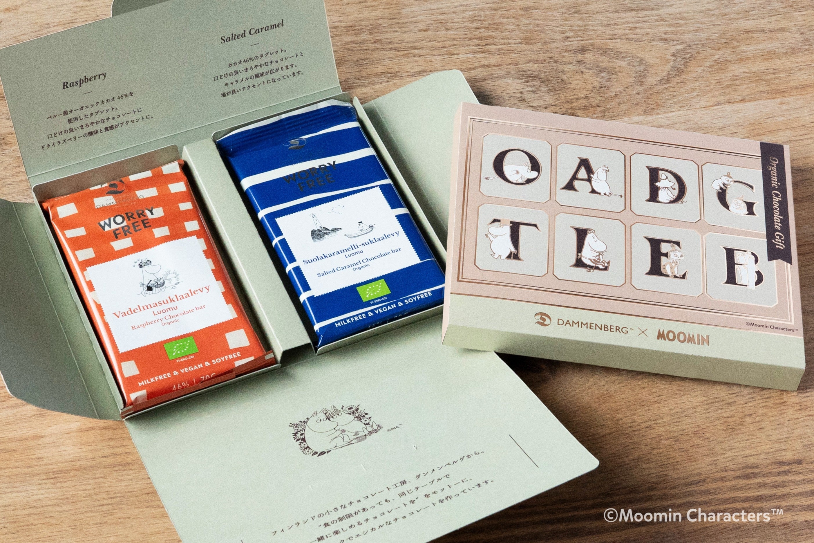 今回のポップアップストアのメイン商品となるオリジナルギフトボックスは、タブレット(板チョコ)の2種「有機ラズベリーチョコレート」と「有機ソルトキャラメルチョコレート カカオ」が包まれた手紙のような仕様が特徴です。ムーミンの人気キャラクターを主役に据えた、特別なデザインに仕上げました。