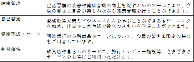企業の管理者さまと従業員さま双方にご利用いただけるコンテンツを取り揃えております。阿波銀行の金融商品と福利厚生代行事業者であるイーウェルの福利厚生サービスや健康サービスといった両者の強みを併せ持ち、人材の採用・定着や健康支援などの面から企業をサポートすることを目的としております。