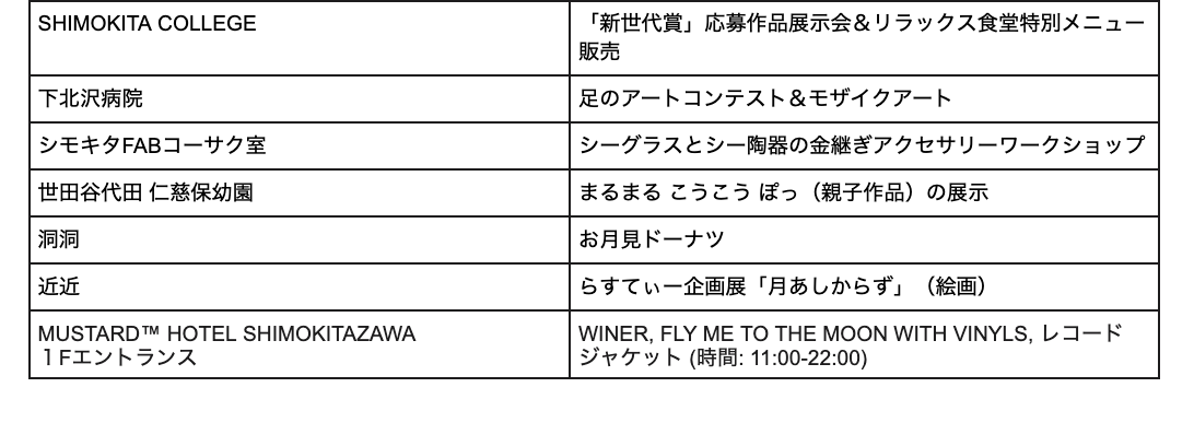その他、シモキタエリアの店舗・施設が、グルメ、文具・雑貨、演劇、映画等さまざまなジャンルで「月」をテーマに商品や企画を手掛けます。例えば、ものづくりスペース「シモキタFABコーサク室」では、ガラス片や陶器片を組み合わせて月の形のオリジナルアクセサリーをつくるワークショップを開催します。また、地域の足の健康を支える足病総合センター「下北沢病院」では、漢字に「月」が付く足の部位(例:膝、大腿等)のフォトコンテストを開催し、入賞者には足にちなんだ商品をプレゼントするほか、集まった写真でモザイクアートを手掛けて病院の正面玄関に掲出します。(掲出は9月22日以降)