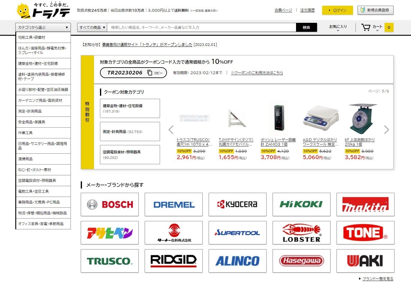 楽天DIYジャンルNo.1の大都が、工具や塗料など18万点を即日出荷する事業者向け通販サイト「トラノテ」を2月1日開始