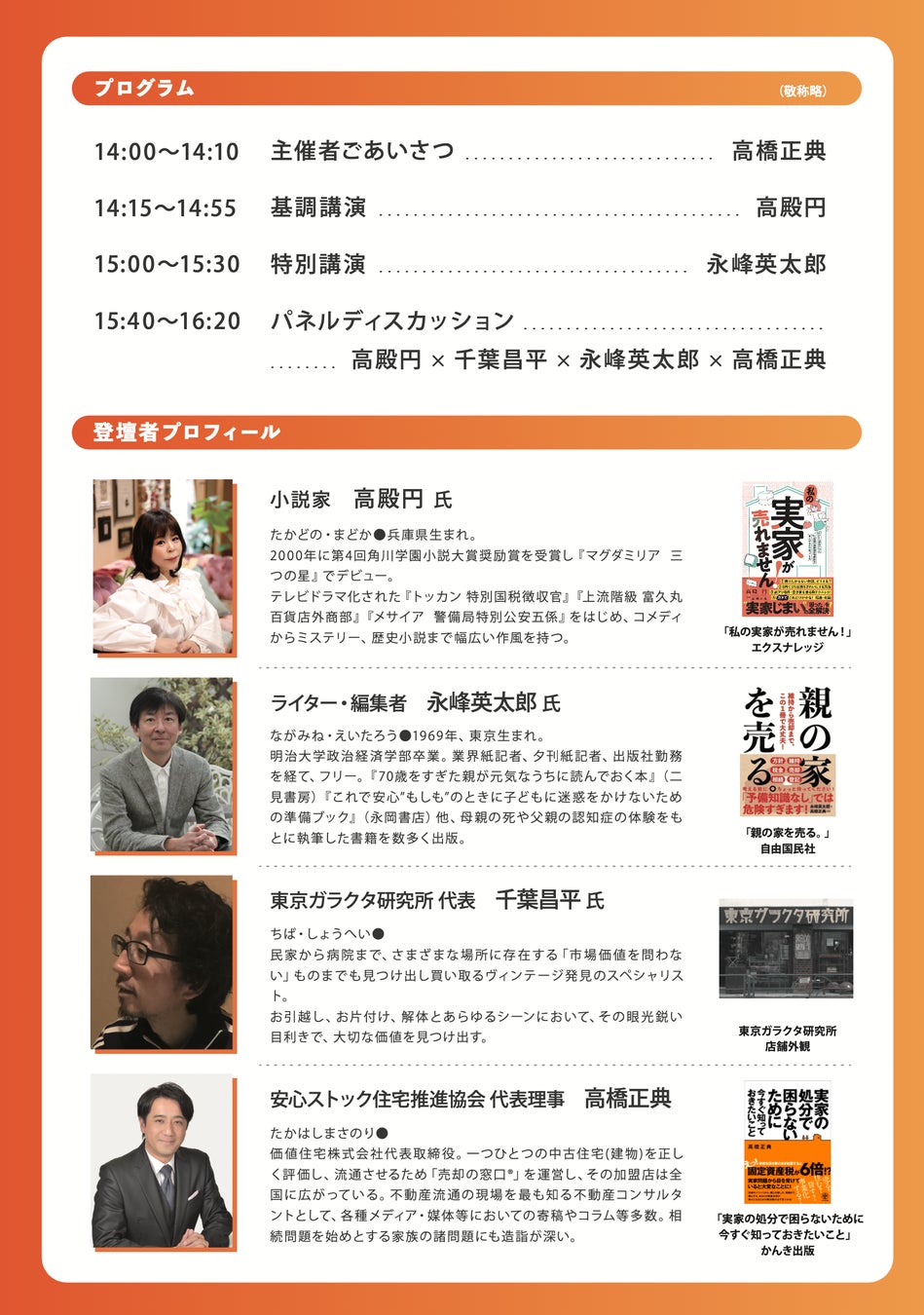 価値住宅株式会社(本社:東京都渋谷区)代表取締役 高橋 正典が代表理事を務める、一般社団法人 安心ストック住宅推進協会は、人口流入の続く都市部において誰もが抱える「実家どうする?」問題について、多種多様な実体験を持つ著名人を集め、親とどう向き合い、どういう準備をしたのか?そして、実際の売買で起きた様々な人間ドラマを語り合い、誰もが当事者になり得る「実家問題」にポジティブに向き合うシンポジウム&無料相談会を開催します。