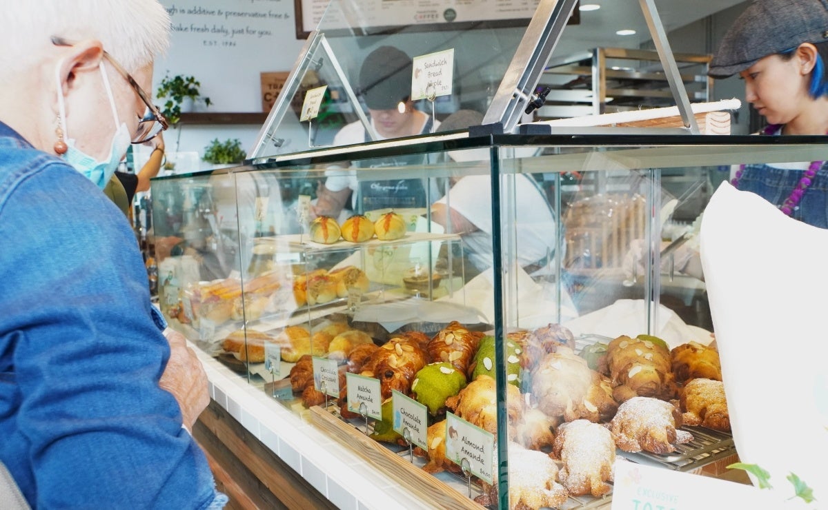 店頭で焼きたてのパンとドリンクを購入し、ハワイのさわやかな海風が吹くオープンエアのテラス席でおいしそうにパンを頬張るお客様の姿も多く見られました。
