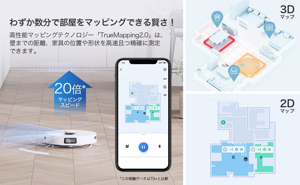 120万画素数の高性能HDRカメラと業界最先端AIチップを搭載した障害物回避システム「AIVI 3.0(アイビー・サンテンゼロ)」搭載。障害物の種類を正しく識別、家具や壁への衝突を軽減します。ペットなど動くモノに対しても賢く回避しながら安全に走行が可能。AIチップが学習し回避精度を継続的に高め、D-ToF技術を応用した最先端マッピングシステム「TrueMapping2.0」との組み合わせにより、最短ルートで効率的に清掃します。