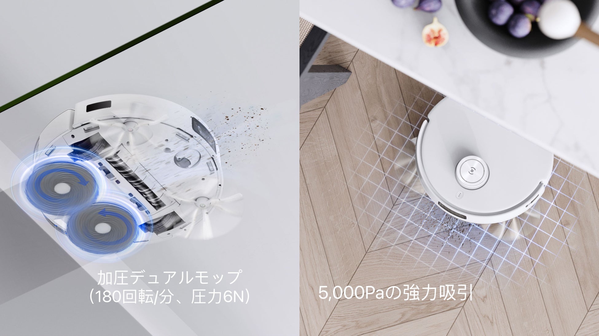 2.5,000Paの最強レベルの吸引力とOZMO TURBO 2.0 加圧回転式デュアルモップ