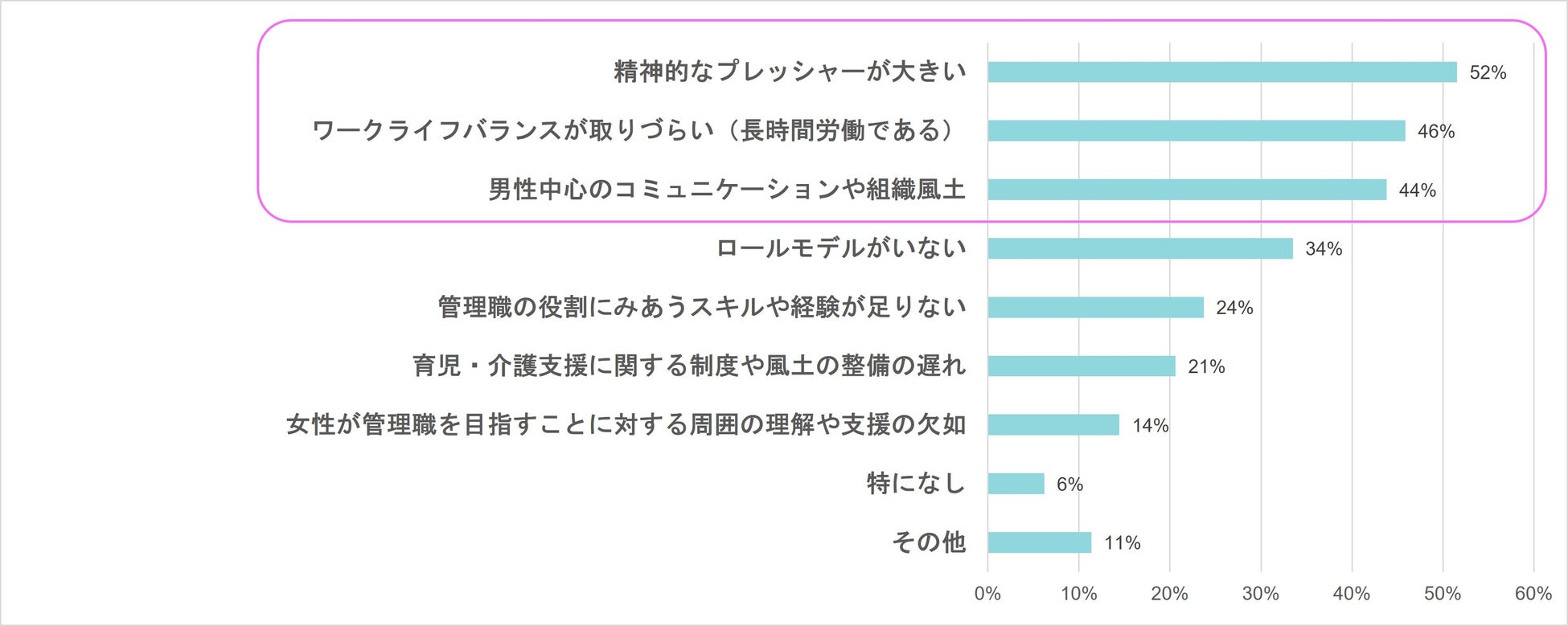 1位「精神的なプレッシャーが大きい」、2位「ワークライフバランスが取りづらい」、3位「男性中心のコミュニケーションや組織風土」