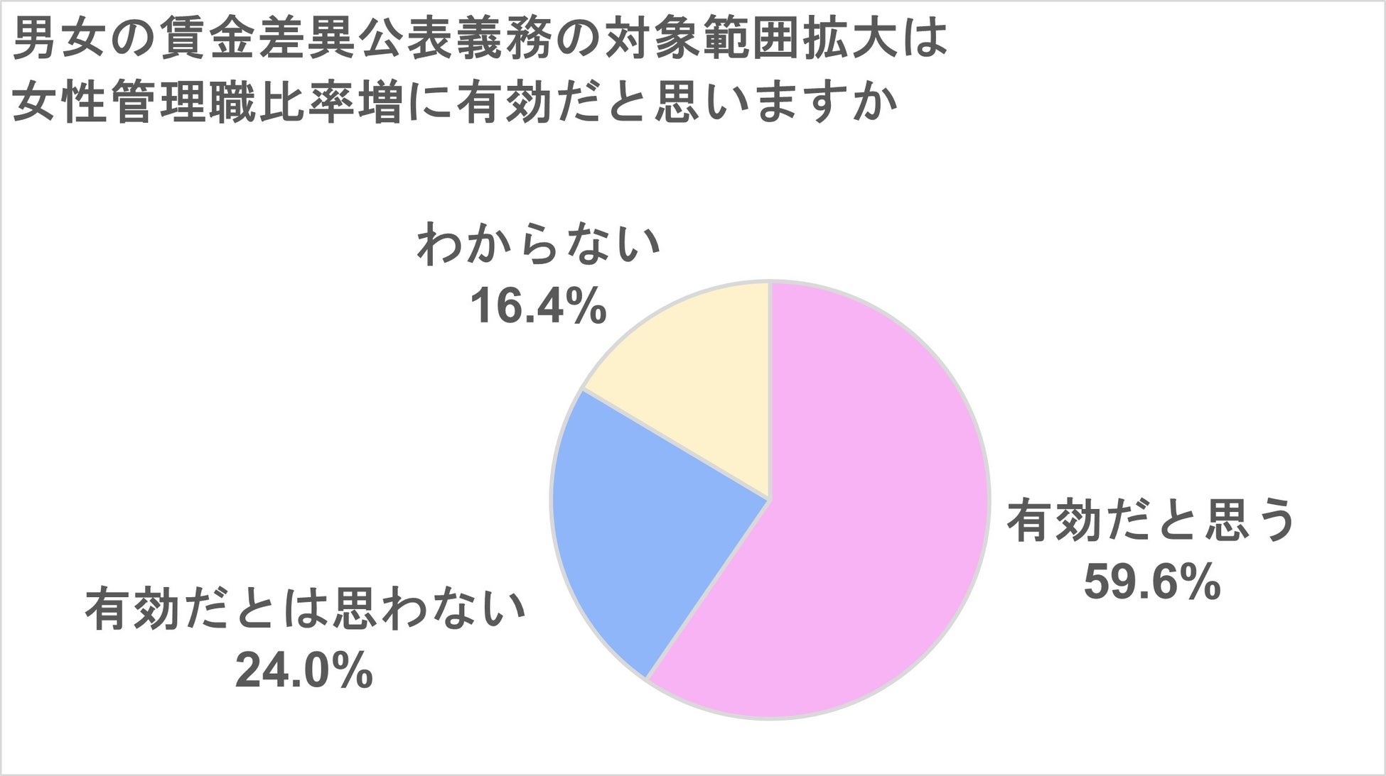 女性管理職比率や男女の賃金差異に関して公表義務化対象企業の拡大が想定されていますが、これらの施策について「女性管理職比率増に有効」と5割以上の女性たちが前向きにとらえていることも明らかになりました。