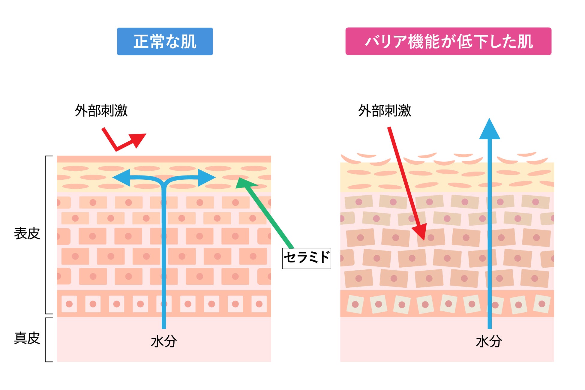 その結果、角質層が乾燥してバリア機能が低下し、外的刺激が侵入しやすくなります。