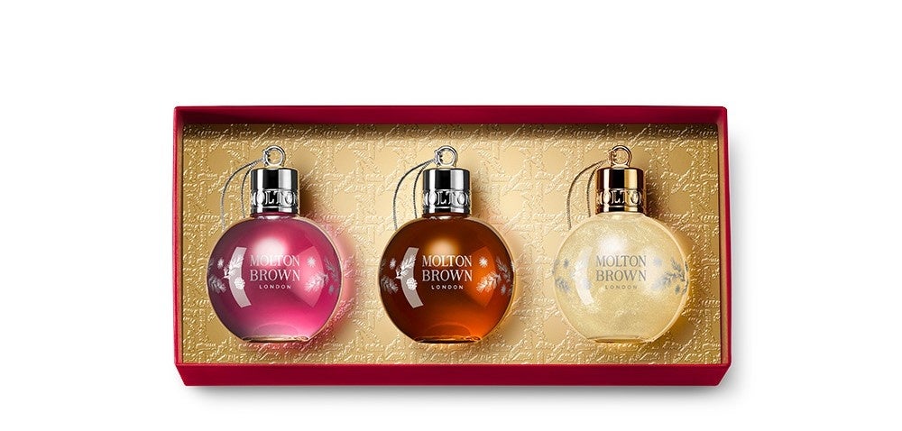 クリスマスツリーのオーナメントであるボーブル型のボトルに入ったバス&シャワージェル3種がセットされています。