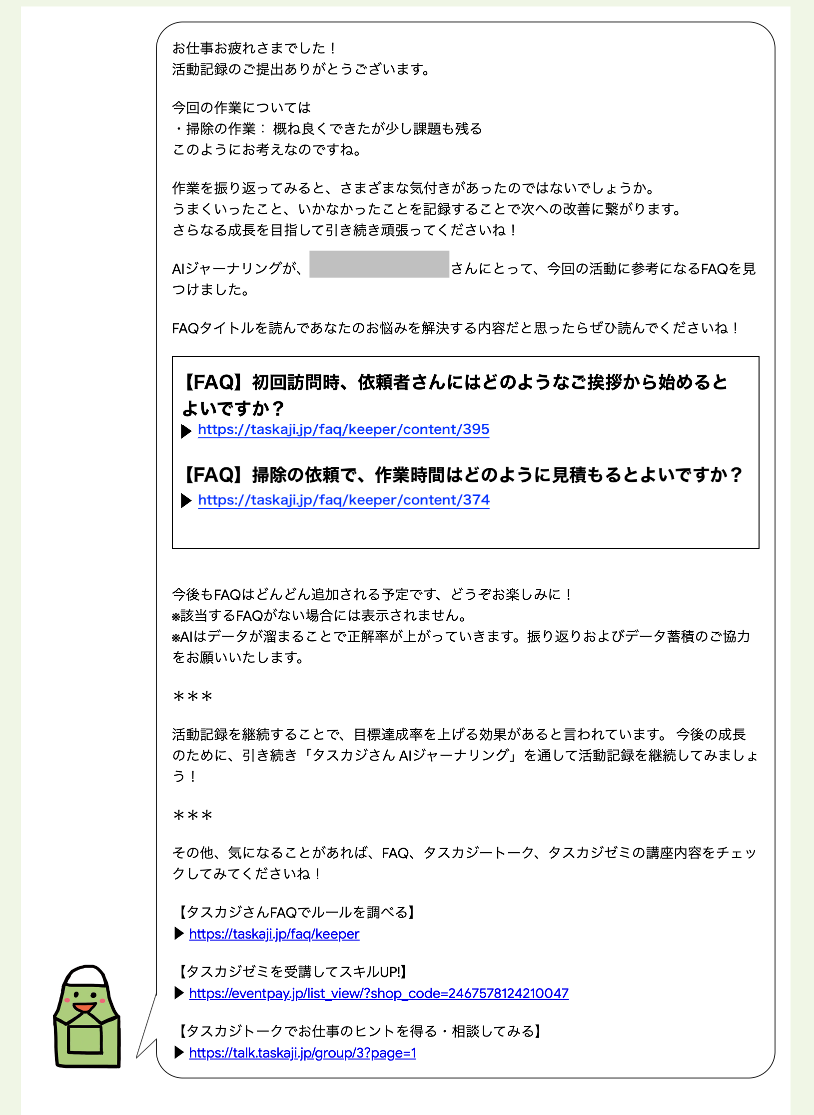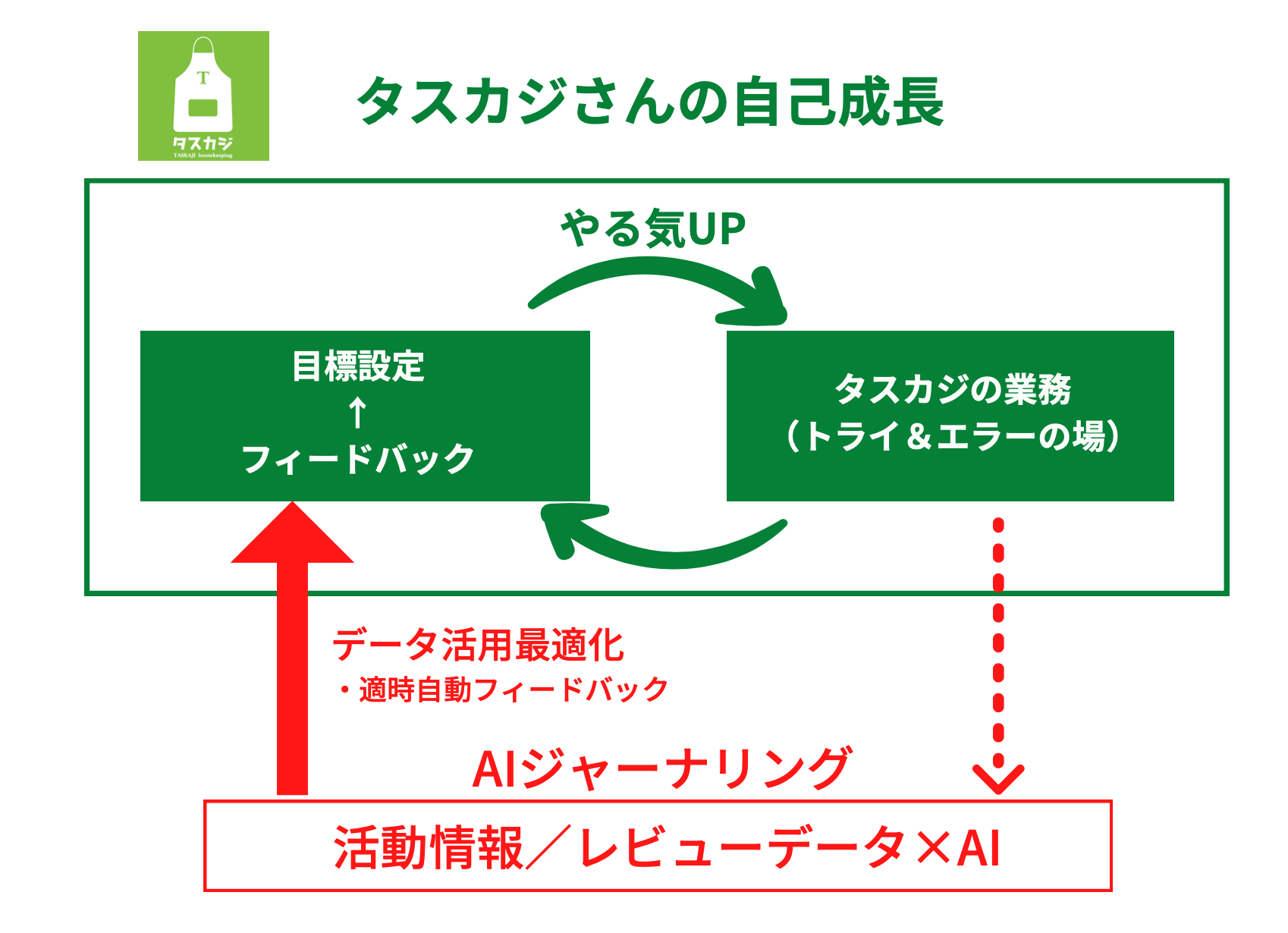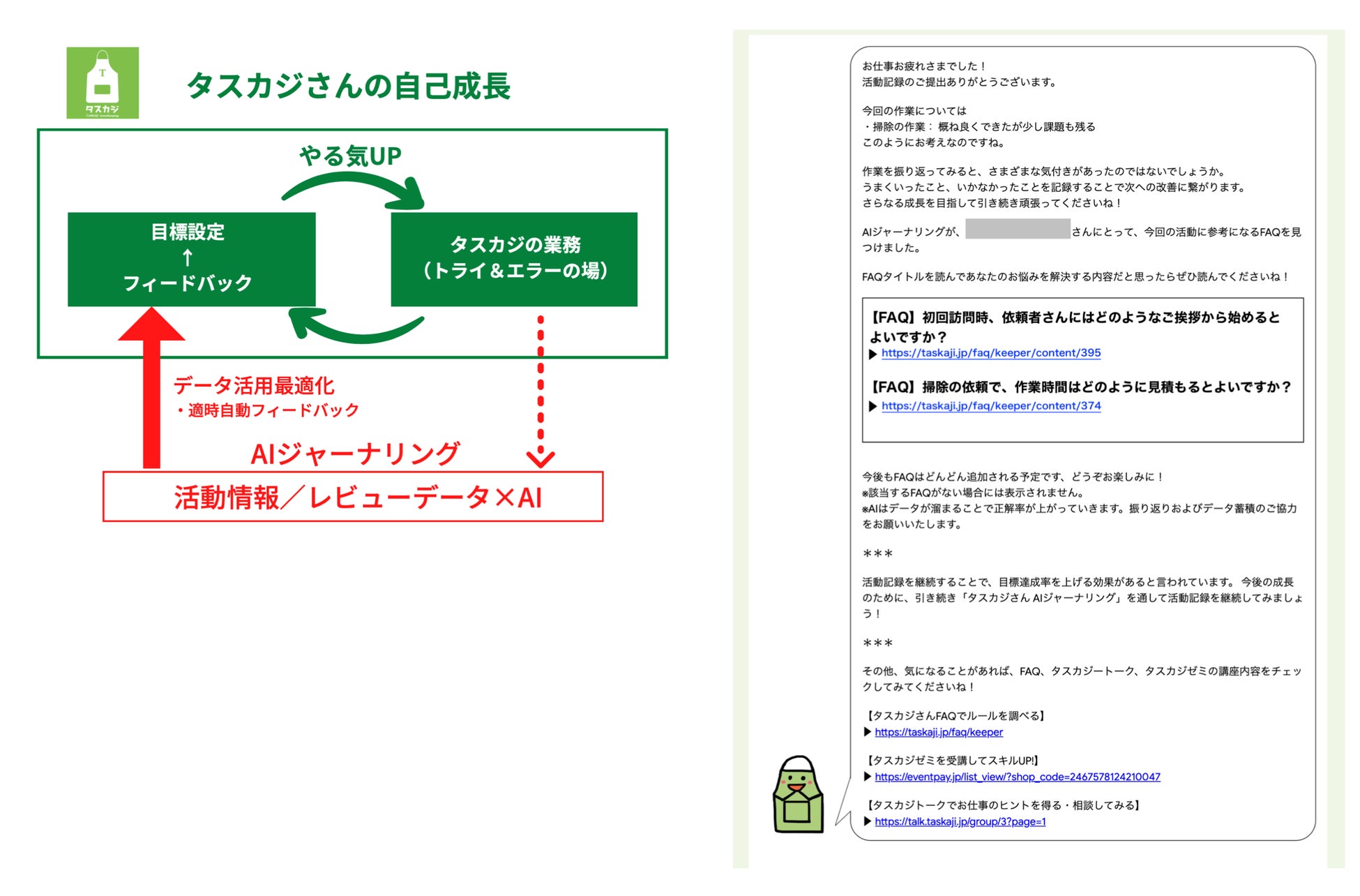 シェアリングエコノミーの家事代行マッチングプラットフォーム「タスカジ」を運営する、株式会社タスカジ(本社:東京都港区、代表取締役:和田幸子、以下タスカジ)は、AIがタスカジさんの活動記録を自動フィードバックする「AIジャーナリング」機能をリリースいたしました。AIジャーナリングでは、タスカジさんが仕事後に入力する活動記録に対し、悩みなどをAIが自動で判断、該当するFAQを案内してフィードバックし、悩みを解決します。タスカジでは、SDGsのゴール8(働きがいも 経済成長も)に貢献し、タスカジさんが自己成長する仕組みを提供してまいります。