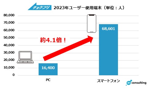 2023年のチョクフリサイト閲覧数を使用端末別で比較したところ、スマートフォンからのサイトアクセスがPCの約4.1倍にのぼることもわかりました。(PC:のべ16,400人、スマートフォン:のべ68,601人)
