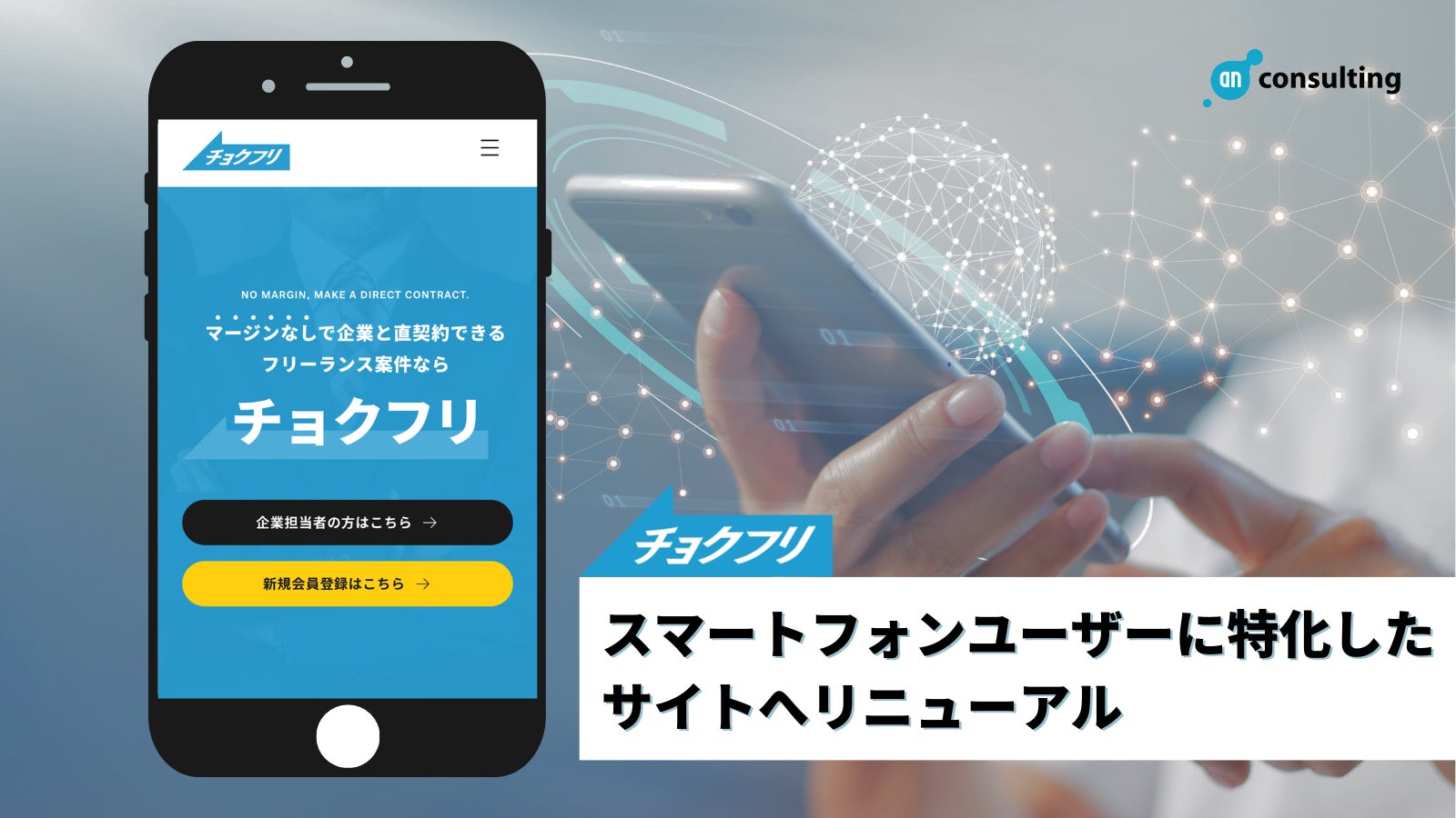 ITフリーランスのマッチングサービス「フリエン」「チョクフリ」を展開するアン・コンサルティング株式会社(本社:東京渋谷区、代表取締役:久利鋭一、以下「当社」という)は、2月1日に「チョクフリ」サイトをスマホ特化型のサイトにリニューアルしたことをお知らせいたします。今回のリニューアルは、スマートフォンユーザーに特化したUIを目指し、全体的なデザインを刷新しました。また、ポジション別・企業別での案件検索も可能になり、よりユーザーにマッチした案件を見つけやすくなりました。
