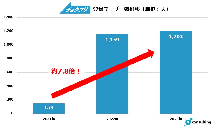 「チョクフリ」の2023年の登録ユーザー数は1,203人で、サービスを開始した2021年と比べ、2年間で約7.8倍に増加しており、多くのITフリーランスの方に利用していただいています。
