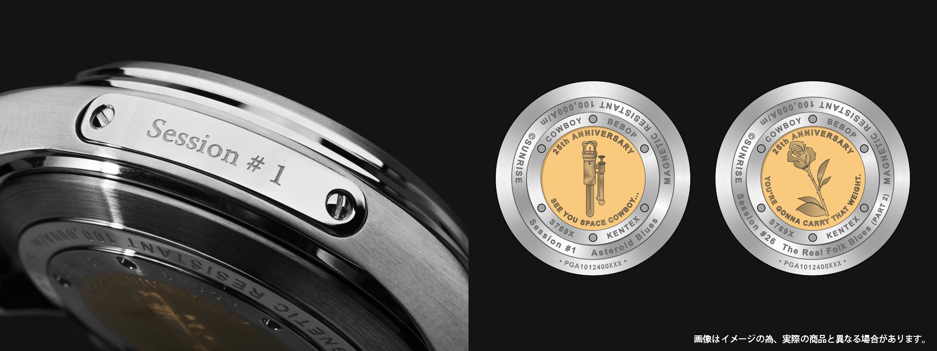 裏蓋には、スパイクと仲間たちがストーリの中で出会うキーアイテムの刻印と共に、各話のタイトル、エンディングメッセージを刻印。1本1本が全26Sessionを思い出させるデザインとなっている。