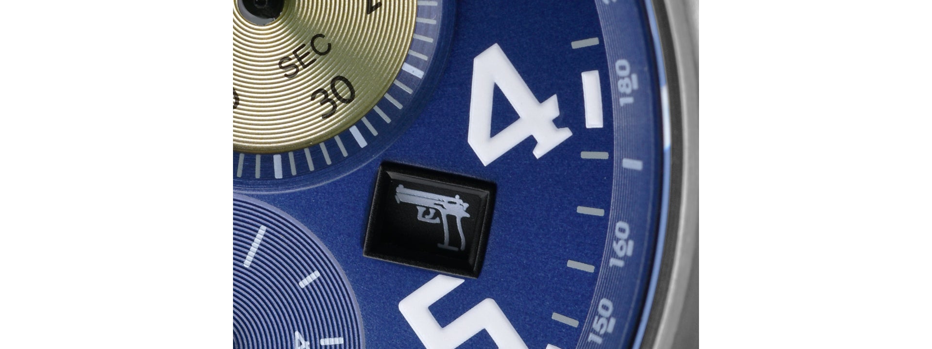 針とインデックスには強畜光が塗布され、夜間の視認性もしっかり確保。クロノグラフ針の畜光形状は、宇宙を駆けるソードフィッシュⅡをイメージしており、暗闇でもなお楽しめるデザイン。