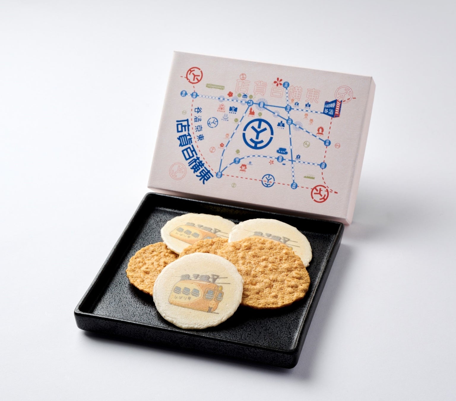 当時の東急線路線図がデザインされた「東横百貨店」の包装紙をデザインしたパッケージに、「ひばり号」をプリントしたえびせんべいと、噛むほどに染み出るえびの塩えび炙り焼きを詰め合焼きのような香ばしさを実現した赤わせました。