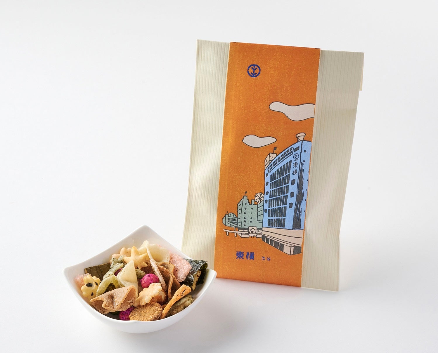 あられに海老せん、豆菓子などをあわせた色とりどりの吹寄せは見て楽しい、食べておいしい京の逸品を、東横百貨店の外観をデザインしたイラストのパッケージに詰めました。