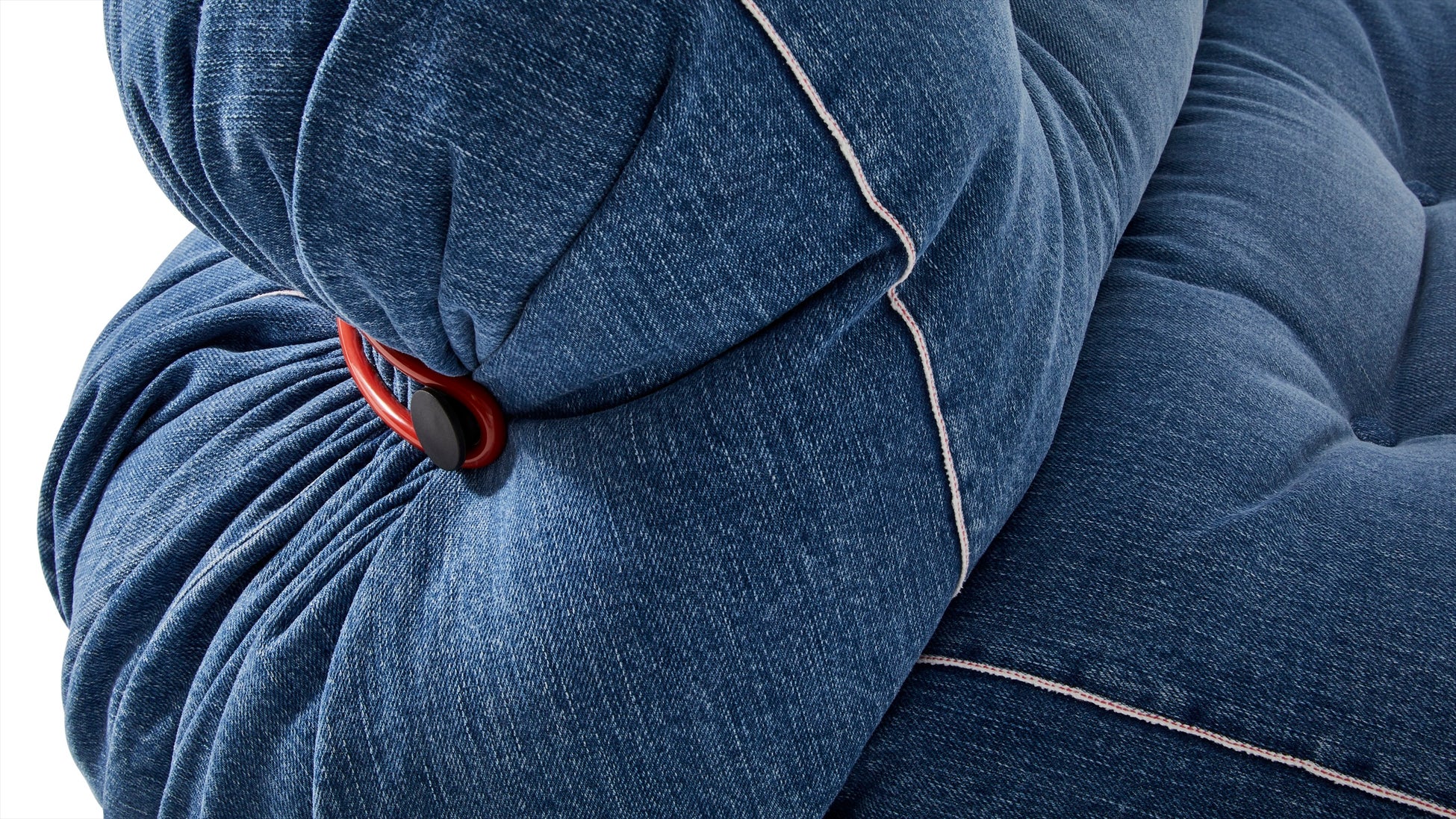 SORIANAアームチェアの特徴的な曲線には、デニムの専門家のサポートの下で選び抜かれた、優れた品質で知られる日本製の高級デニムが使用されています。