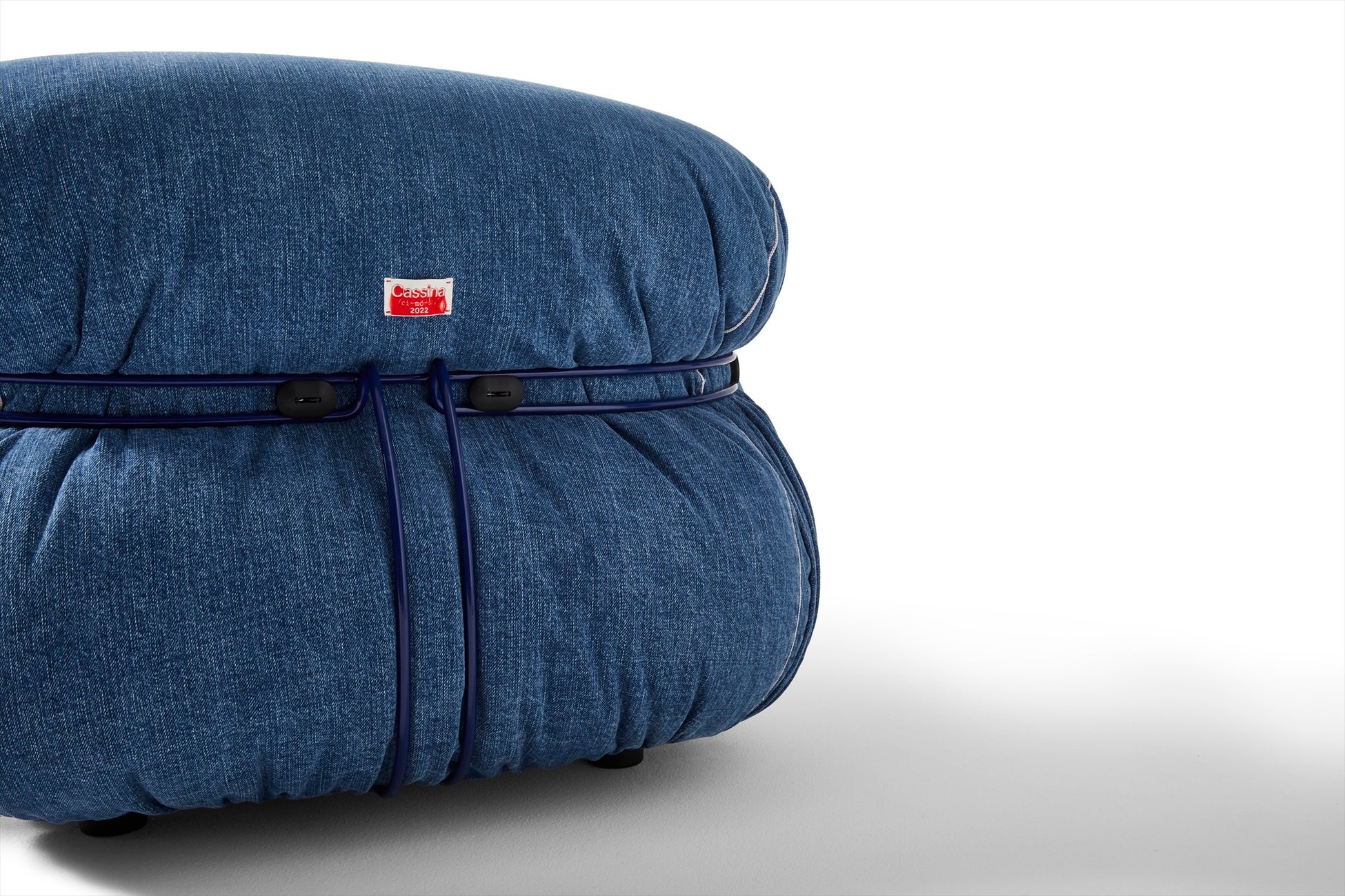 カッシーナ・ラボが手がけたSORIANAのデニム仕様は、環境への配慮はそのままに、循環型の素材を採用しています。中材の一部に使用されている素材は耐久性に優れ、生分解性があり、ライフサイクル終了後はコンポスト(堆肥化)が可能です。また、プラスチックバンク®から回収された100%リサイクルPETブローイングファイバーパッドが、快適な座り心地を提供。この素材は、ソフトキルトのように内部構造を包むスリップカバーにも使用されています。