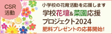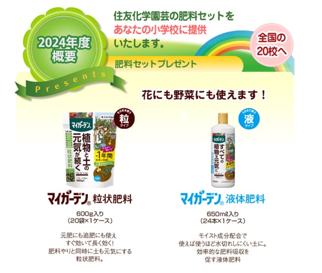 プロジェクト内容 | ①肥料セット提供(1校につき) 「マイガーデン液体肥料」 650ml入り(24本×1ケース)計24本 「マイガーデン粒状肥料」 600g入り(20袋×1ケース)計20袋 ②当選校からの園芸活動メッセージを「eグリーンコミュニケーション」内の「学校花壇&菜園応援プロジェクト2024」活動報告ページで随時公開 |
