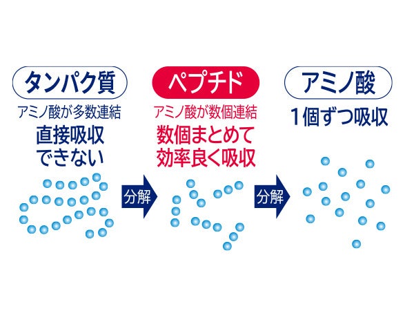口から摂取したタンパク質(プロテイン)は体内でペプチド、アミノ酸に分解されるため、吸収に時間がかかります。また、ペプチドとアミノ酸を比較すると、複数のアミノ酸が連なったペプチドの方がより効率良く吸収されます。本商品は大豆ペプチドを使用しているため、素早くアミノ酸を吸収することができます。