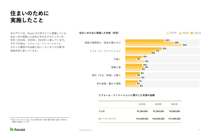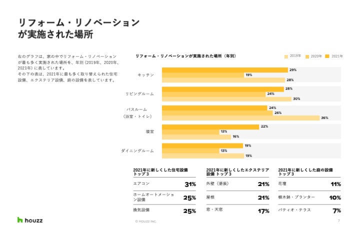 調査内容:「HOUZZ & HOME 市場調査」は、リフォーム・リノベーション、新築、家具や部屋の装飾など、住まいの変更について毎年実施される Houzz でもっとも大規模な調査で、室内の改修、住宅設備の交換、エクステリアの工事など、2021年中に実施されたリフォーム・リノベーション状況について幅広くまとめています。また、費用や予算、住まいの専門家への依頼状況、リフォーム・リノベーションの理由のほか、2022年中のリフォーム・リノベーションの予定についても調査を行いました。