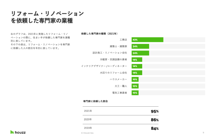 リフォーム・リノベーションを実施する際、家づくりの専門家に仕事を依頼した人は2021年には95%にのぼり、 2020年の86%からさらに増えました。依頼した専門家の種類では、工務店が43%でもっとも多く、昨年と比較しても34%から9ポイント増加しました。続いてリノベーション会社と建築家が24%で、それぞれ2020年の16%、9%から大幅に上昇しました。